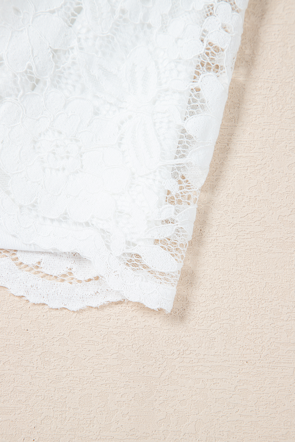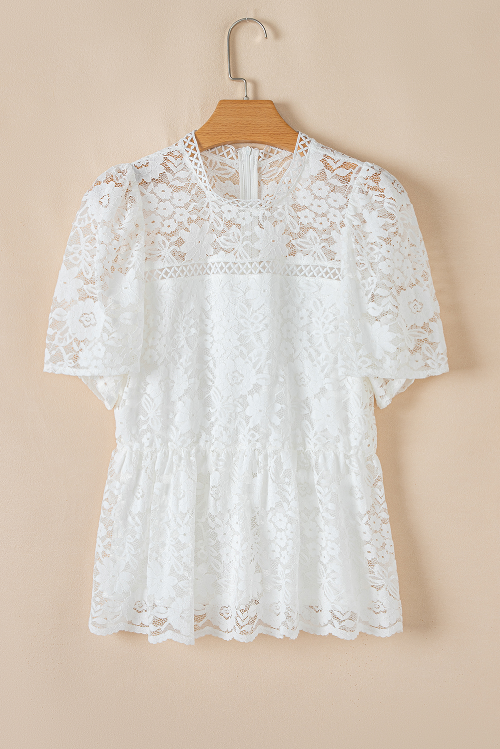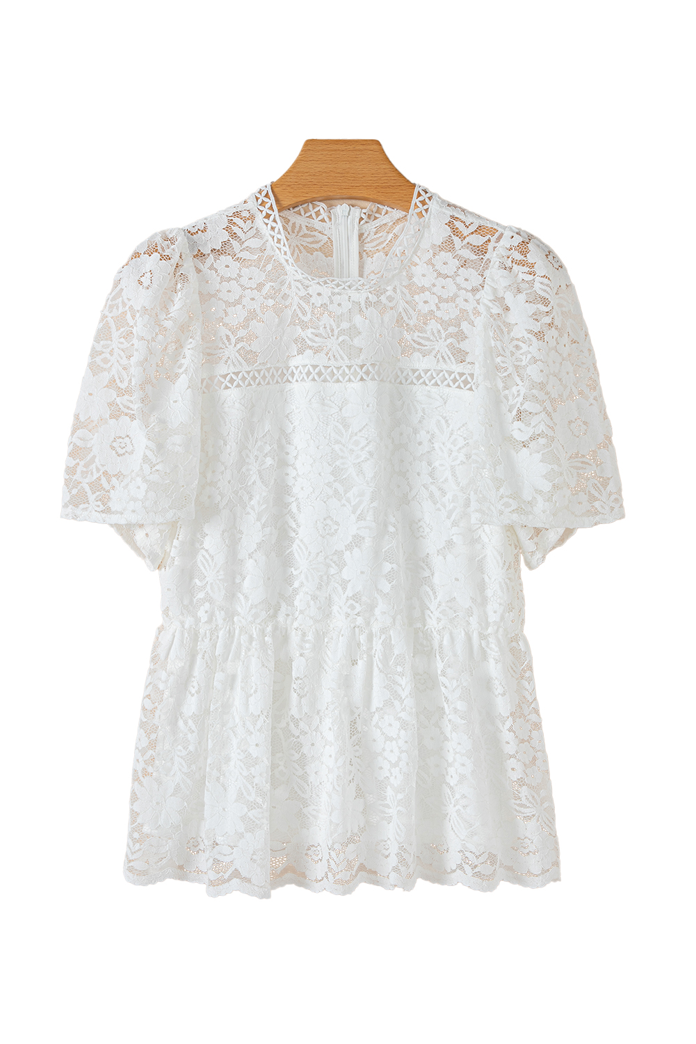 White Short Sleeve Scalloped Floral Lace Peplum Blouse