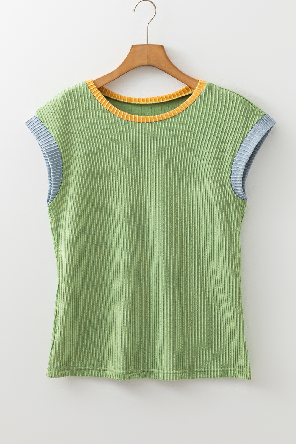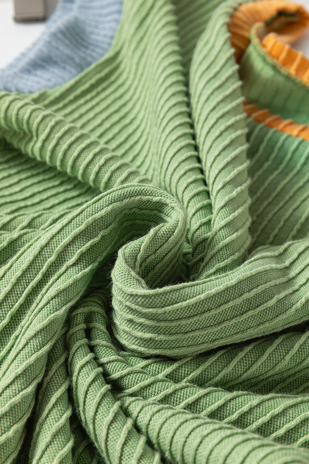 Grass Green Color Block Corded Knit Crew Neck Tee