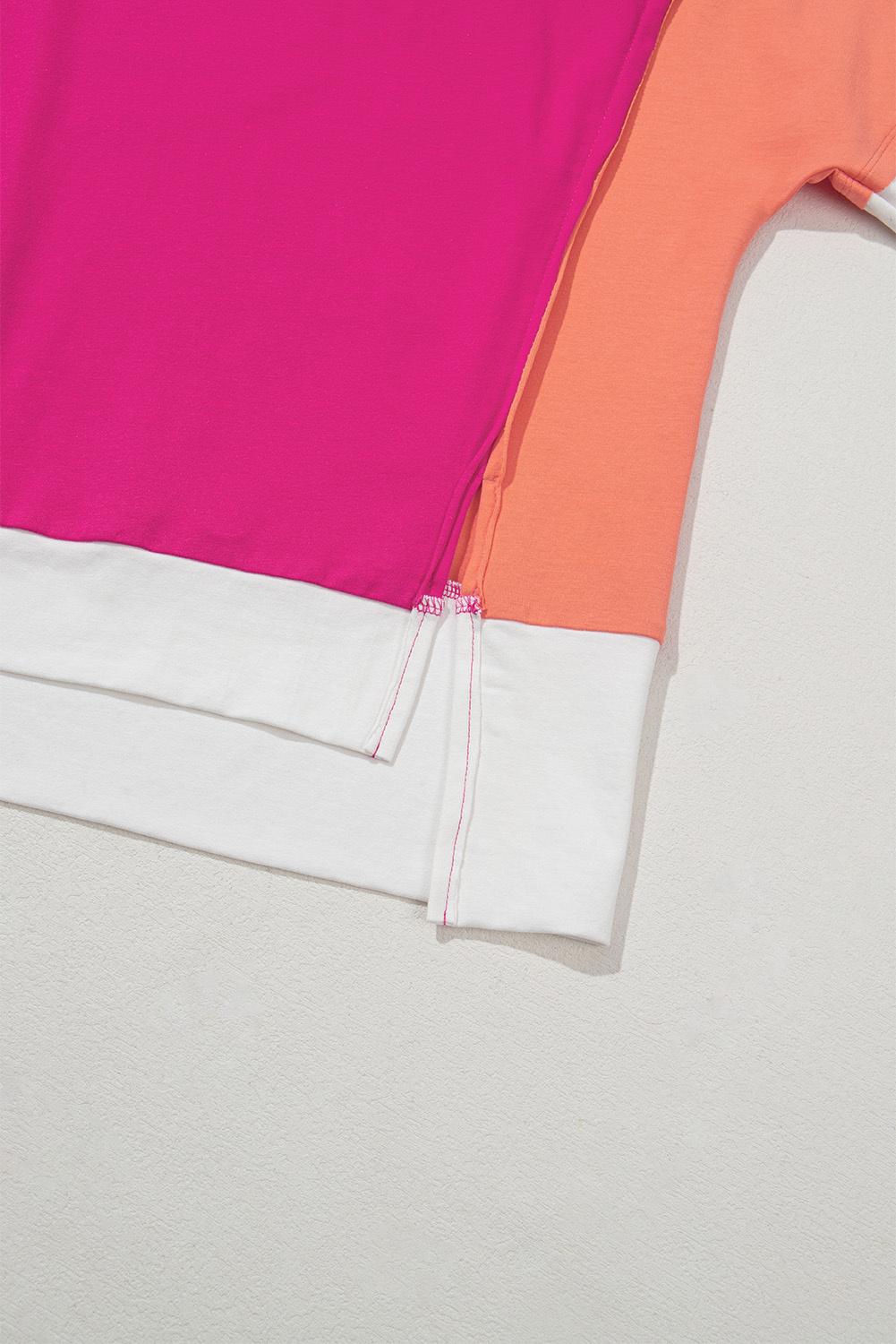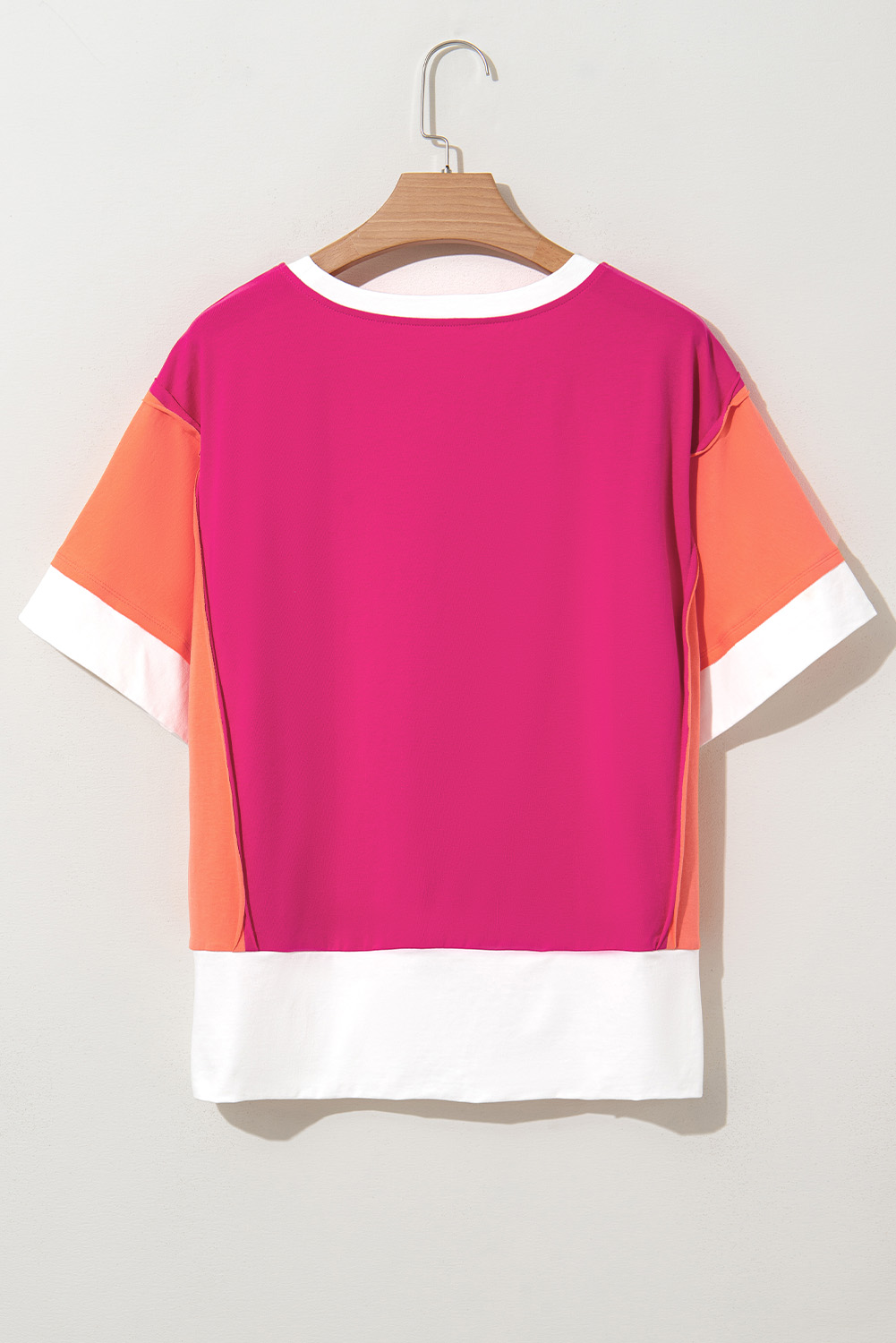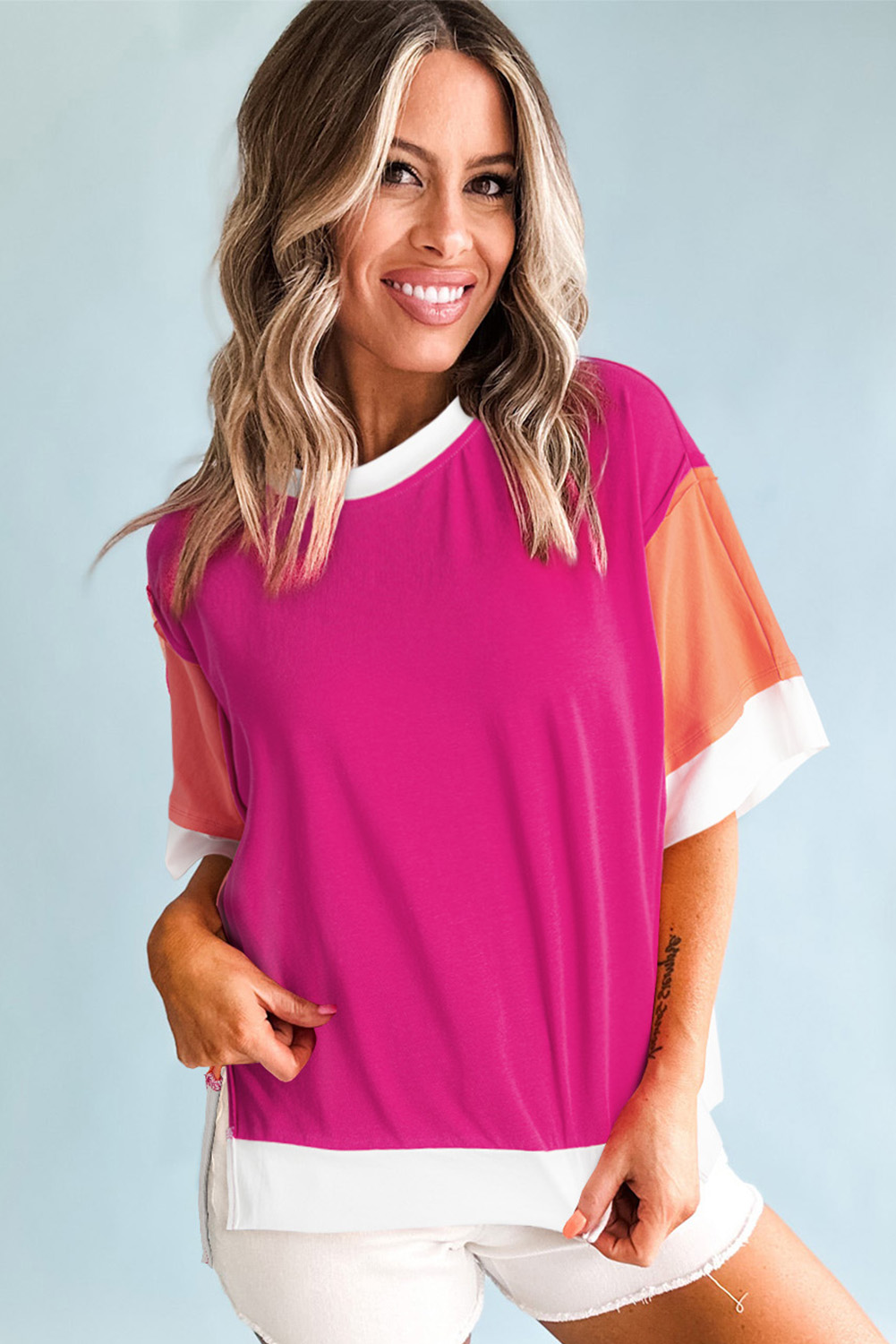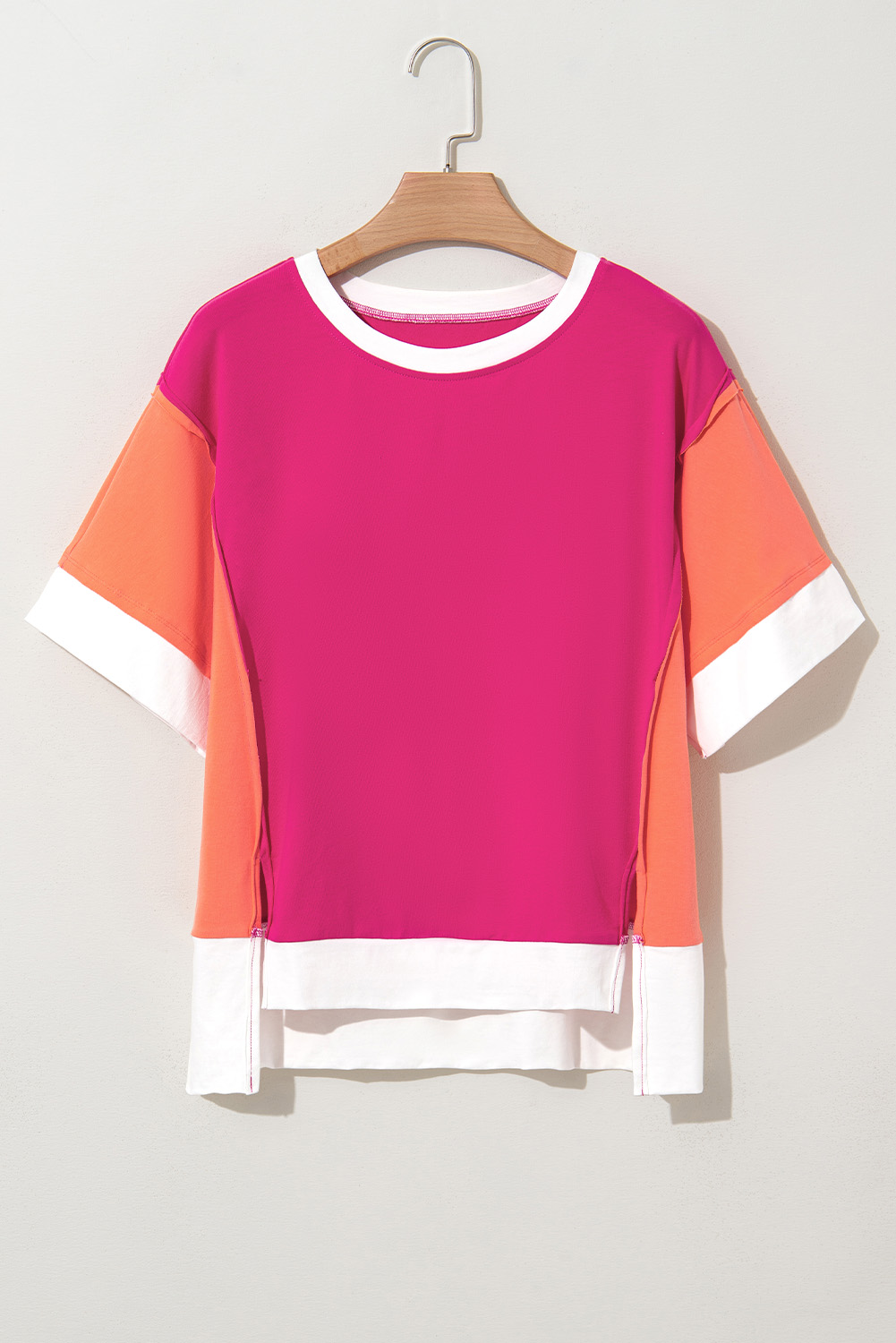 Rose Red Color Block Patchwork Side Slits Loose Fit T Shirt