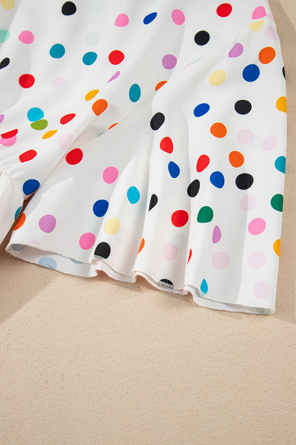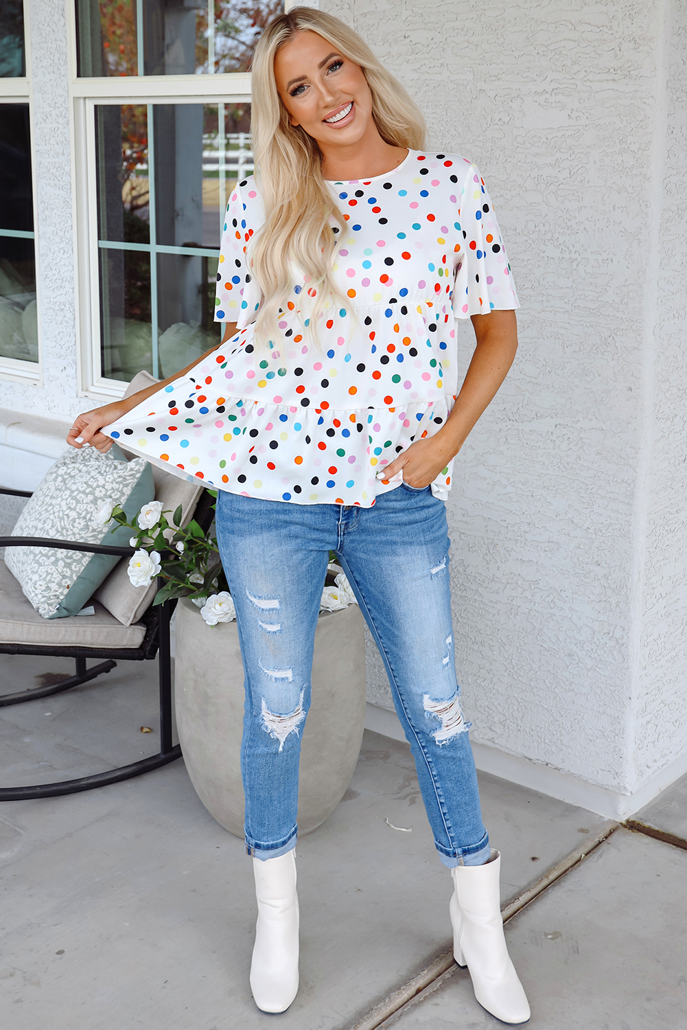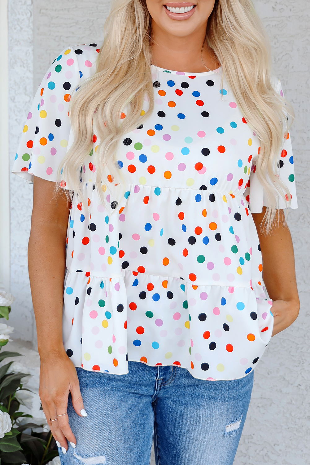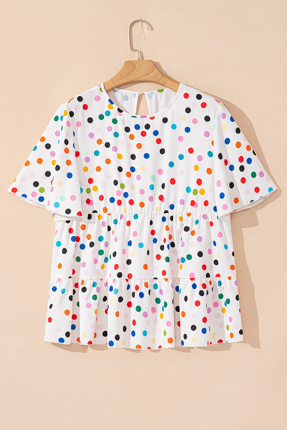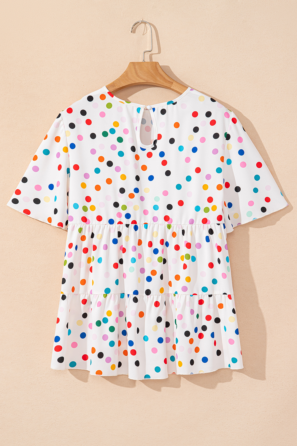 White Colorful Polka Dot Short Sleeve Tiered Ruffled Babydoll Blouse