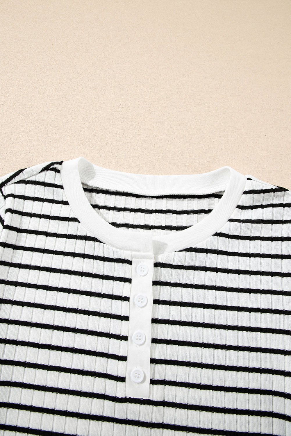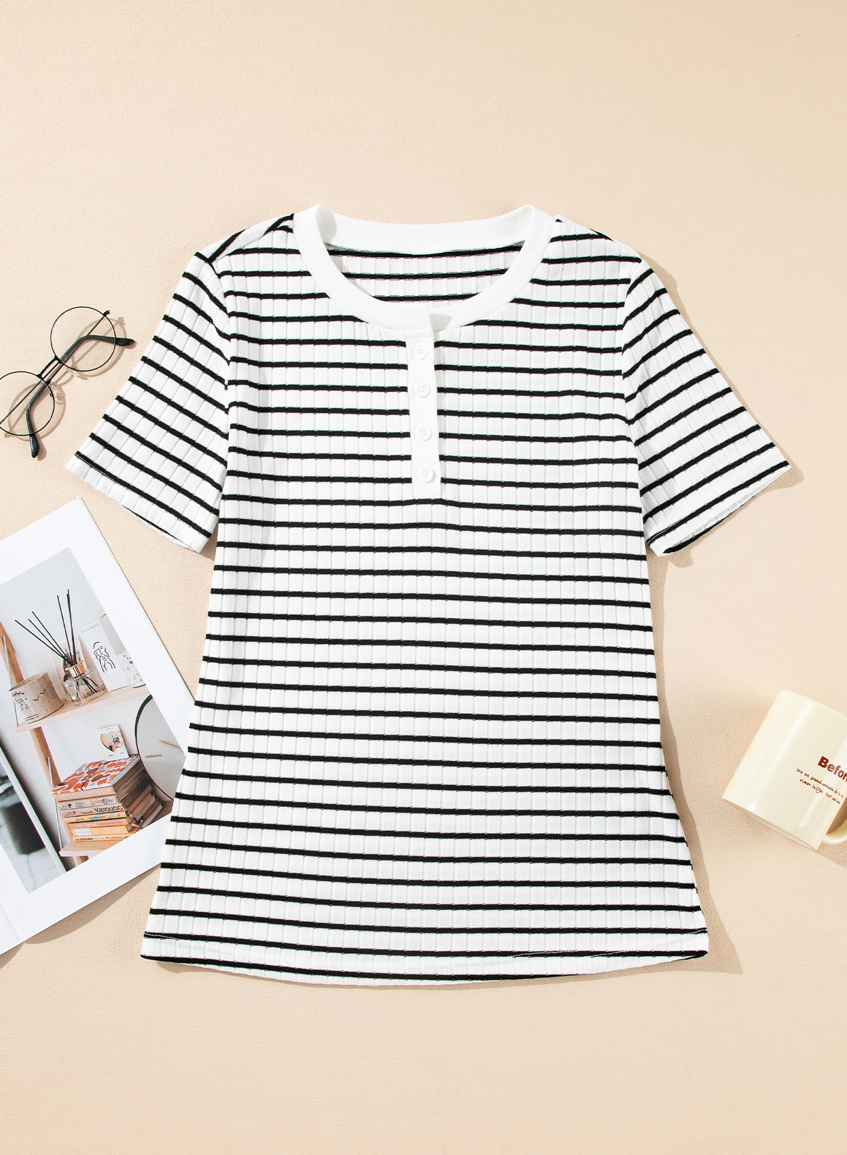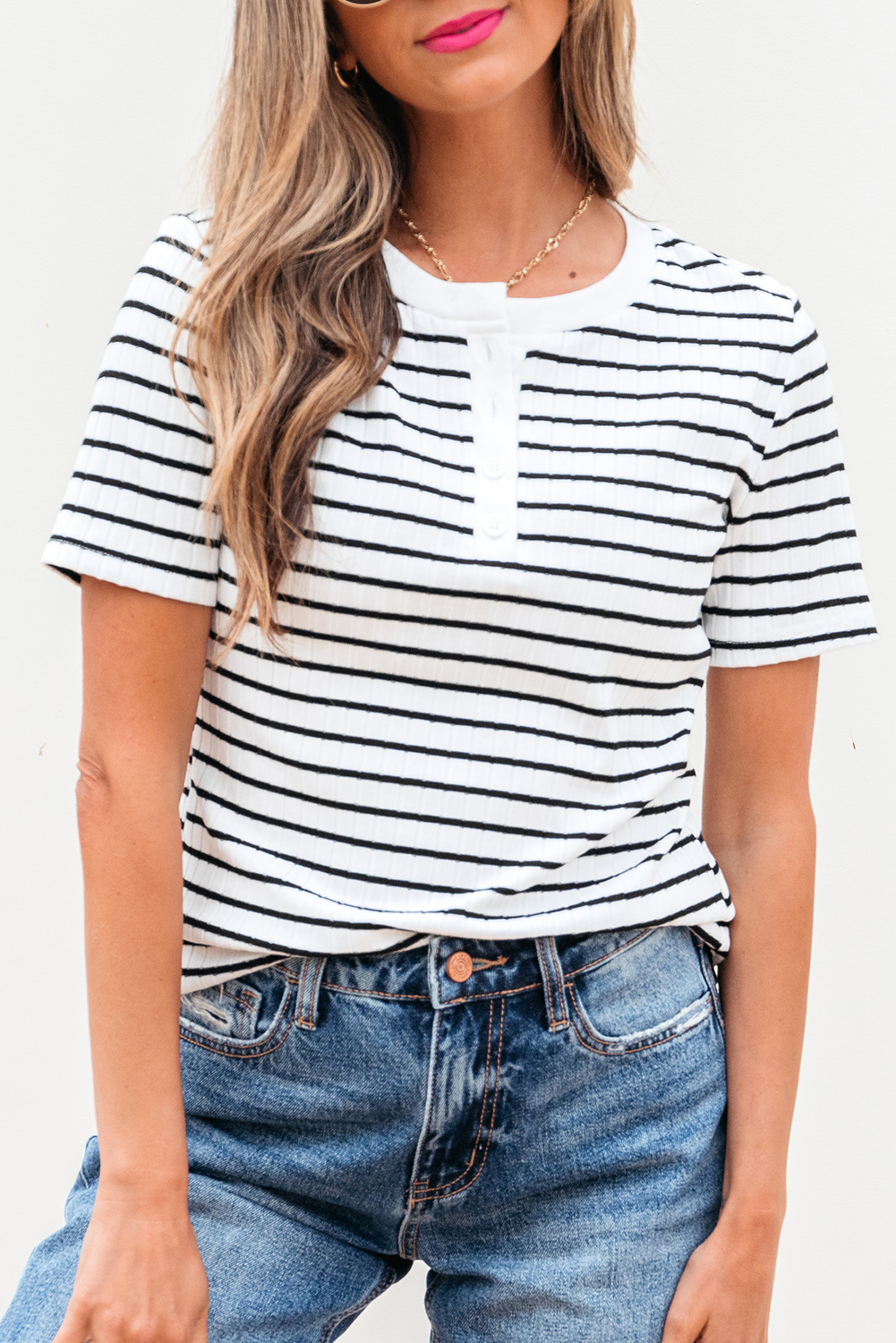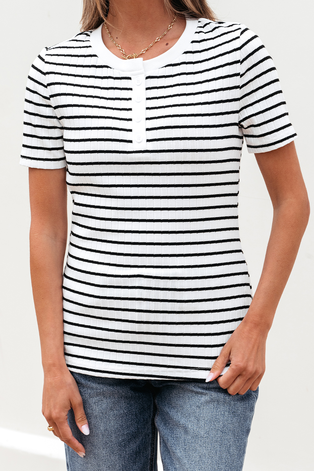 White Stripe Textured Short Sleeve Buttoned Henley Top