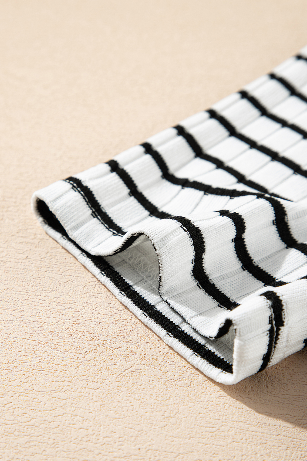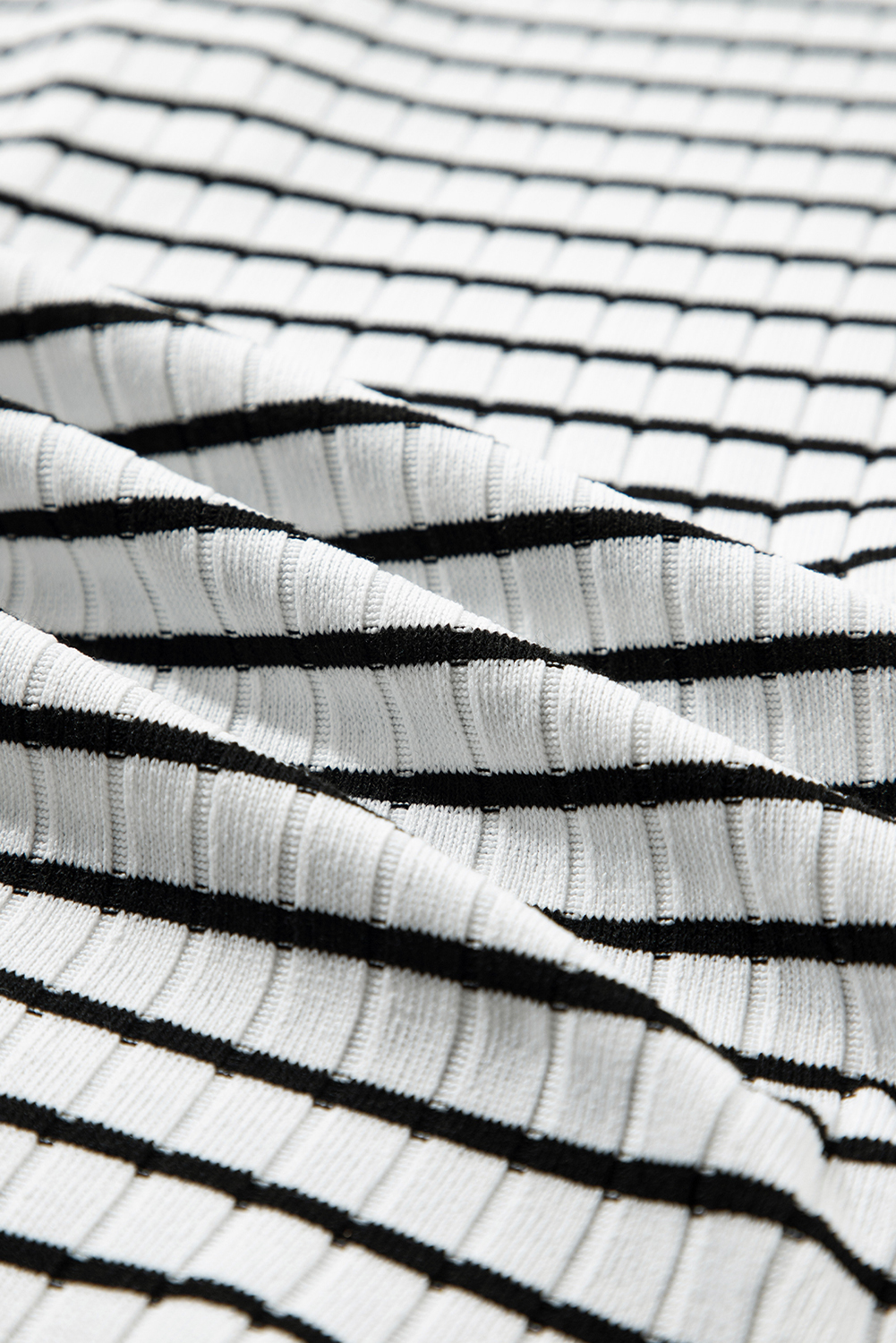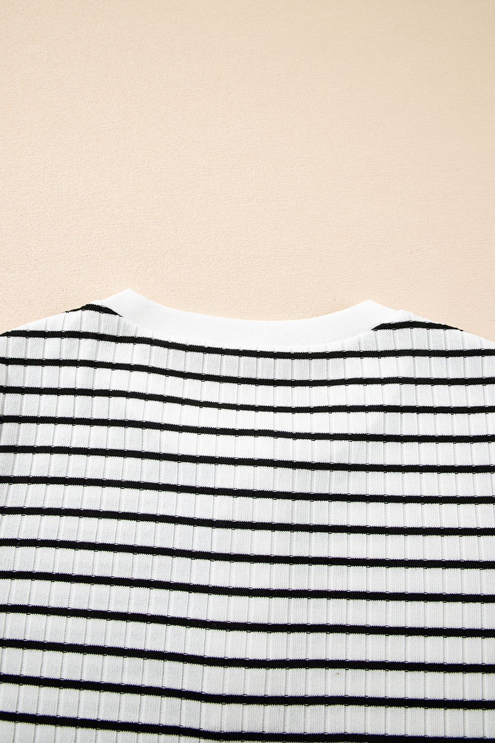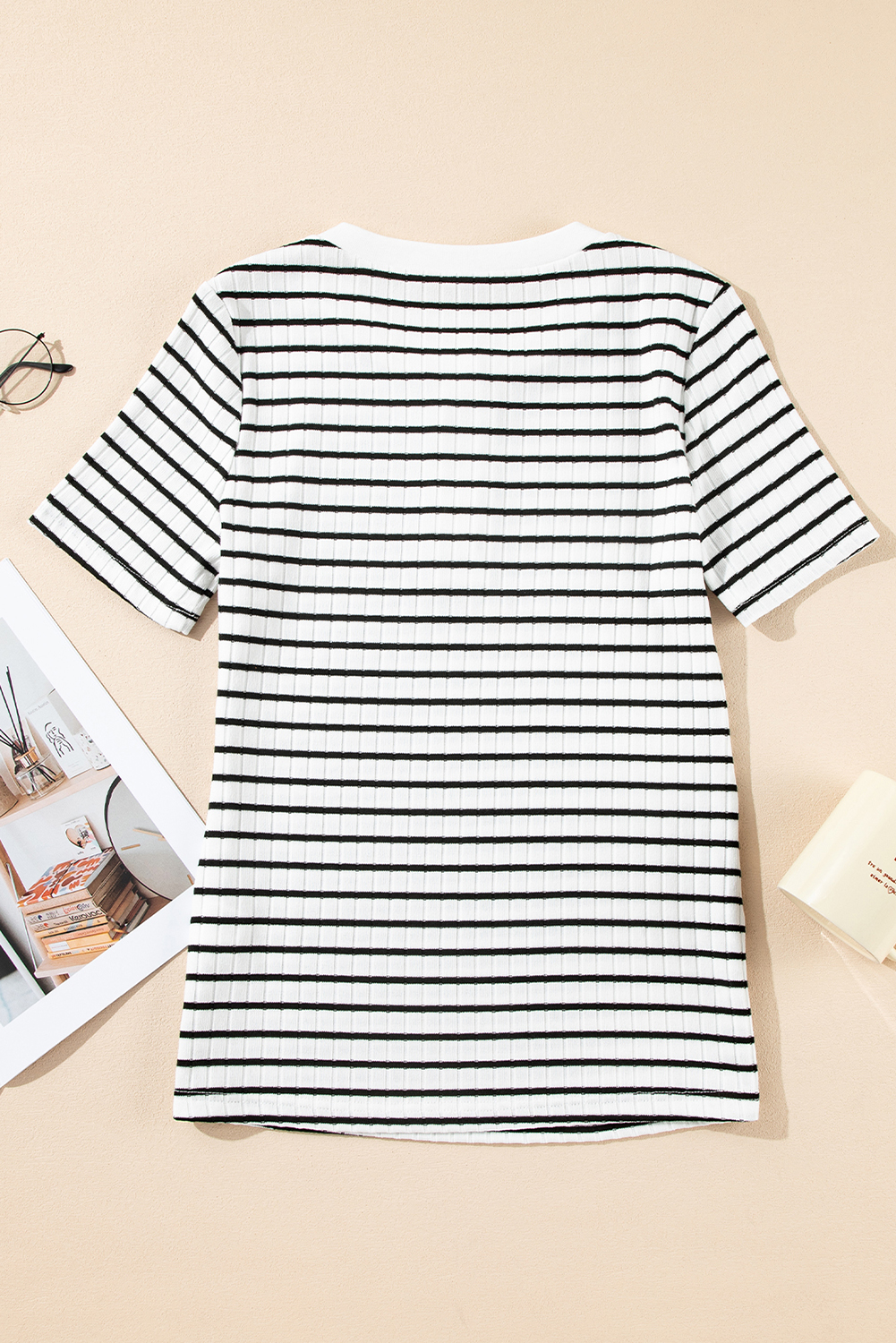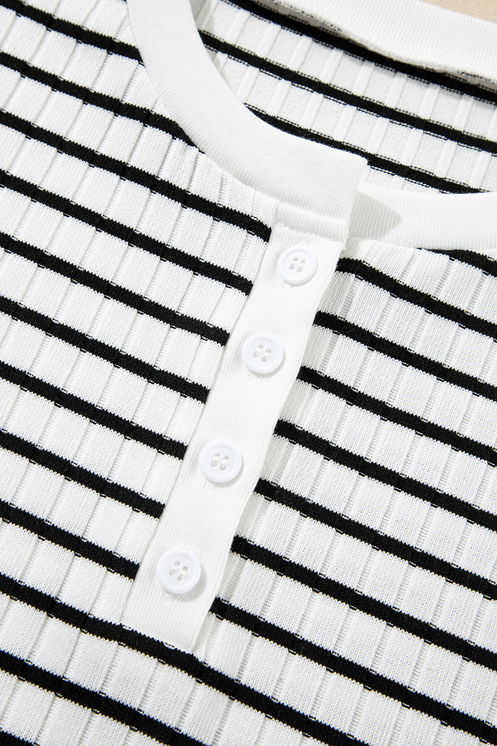 White Stripe Textured Short Sleeve Buttoned Henley Top