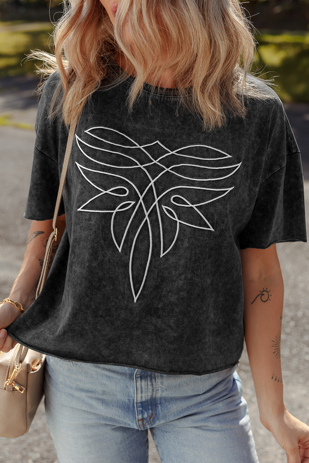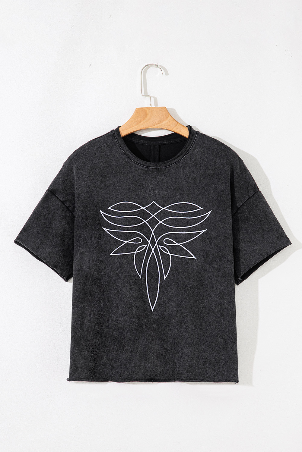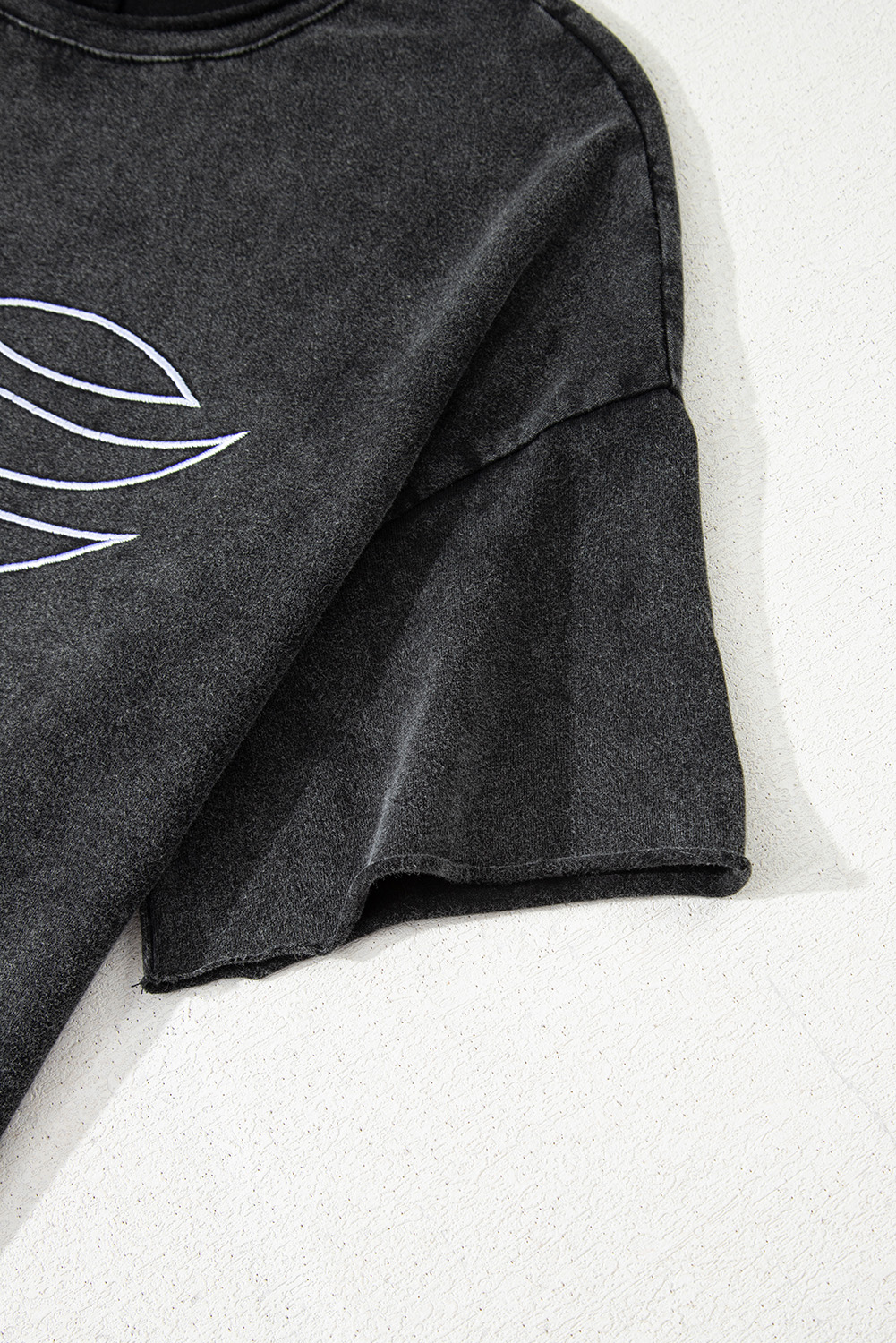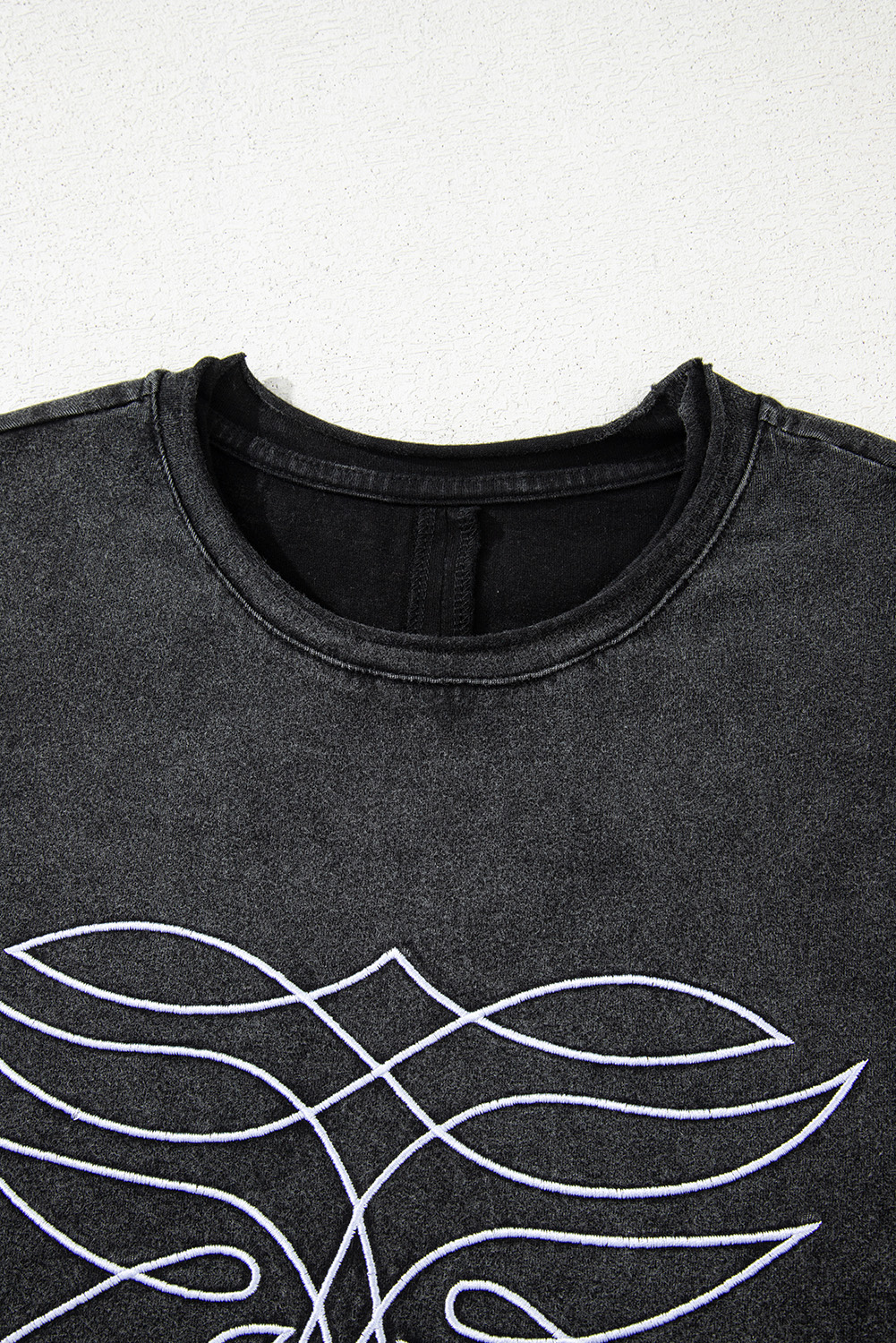Black Floral Embroidered Mineral Wash Crew Neck T Shirt