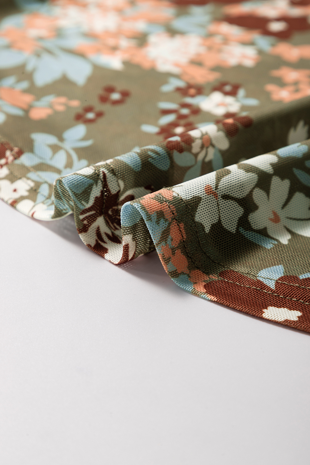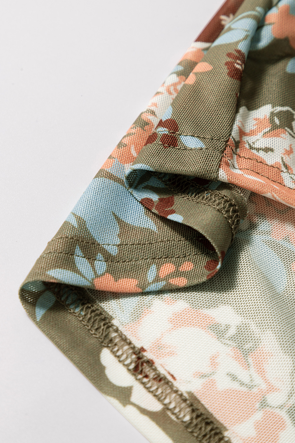 Green Floral Print Mesh Fitted Long Sleeve Top