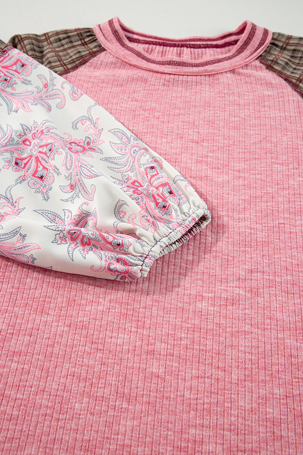 Fushia Mixed Print Raglan Sleeve Ribbed Knit Patchwork Blouse
