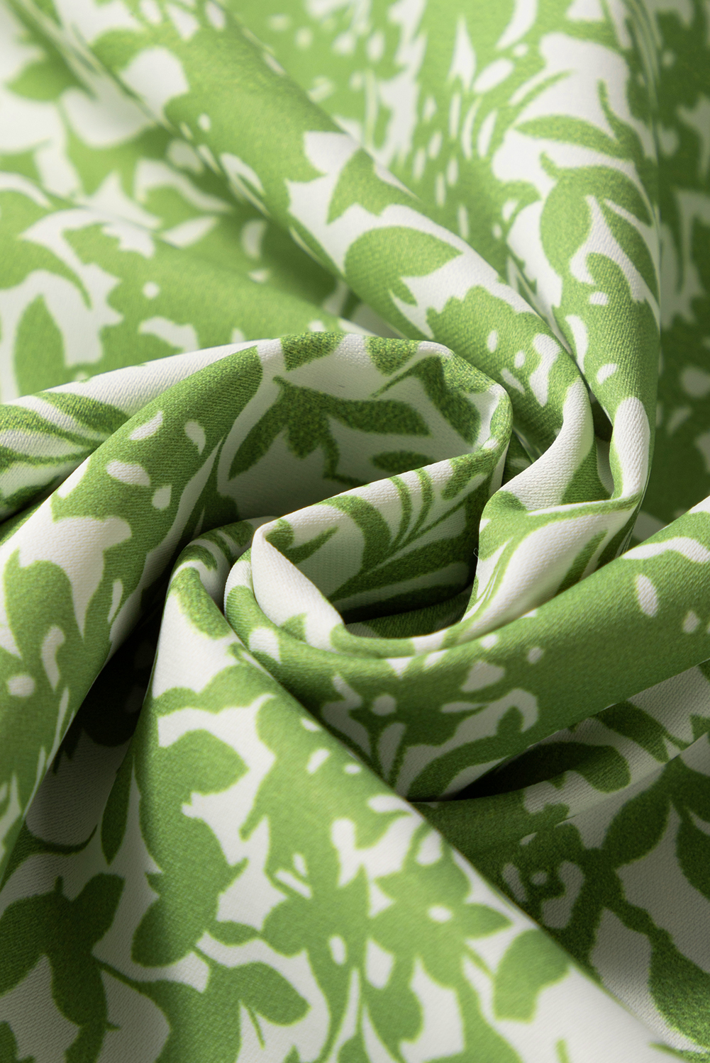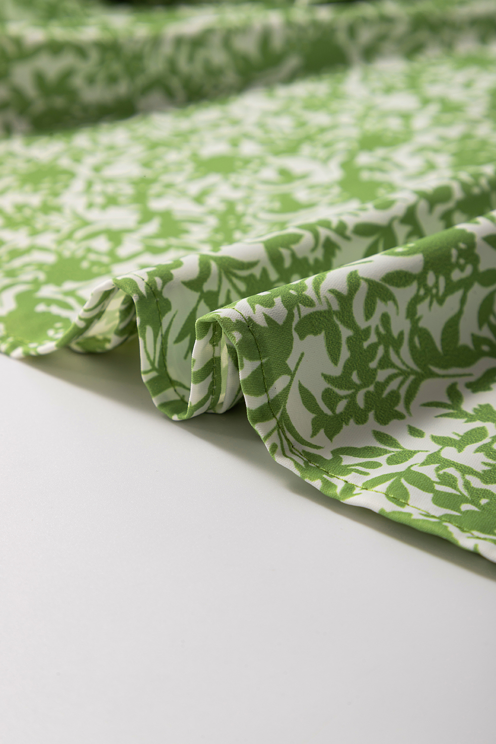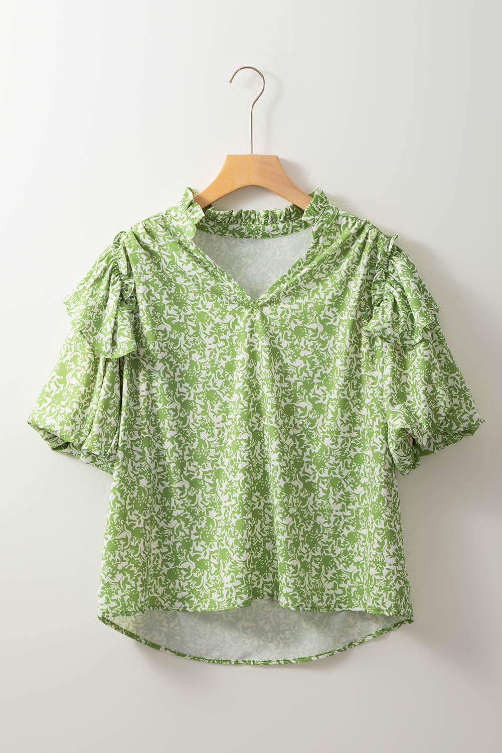 Light Green Floral Ruffle Puff Short Sleeve Frilled Collar V Neck Blouse