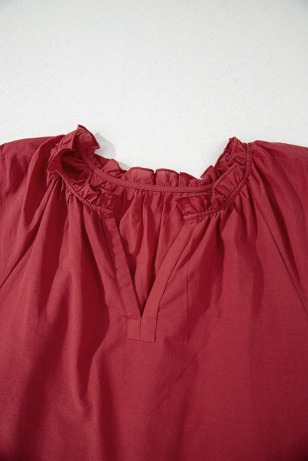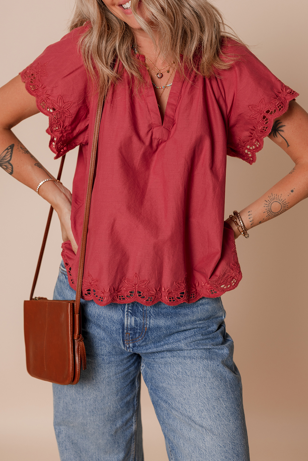 Red Dahlia Floral Embroidered Scallop Trim Short Sleeve V Neck Blouse