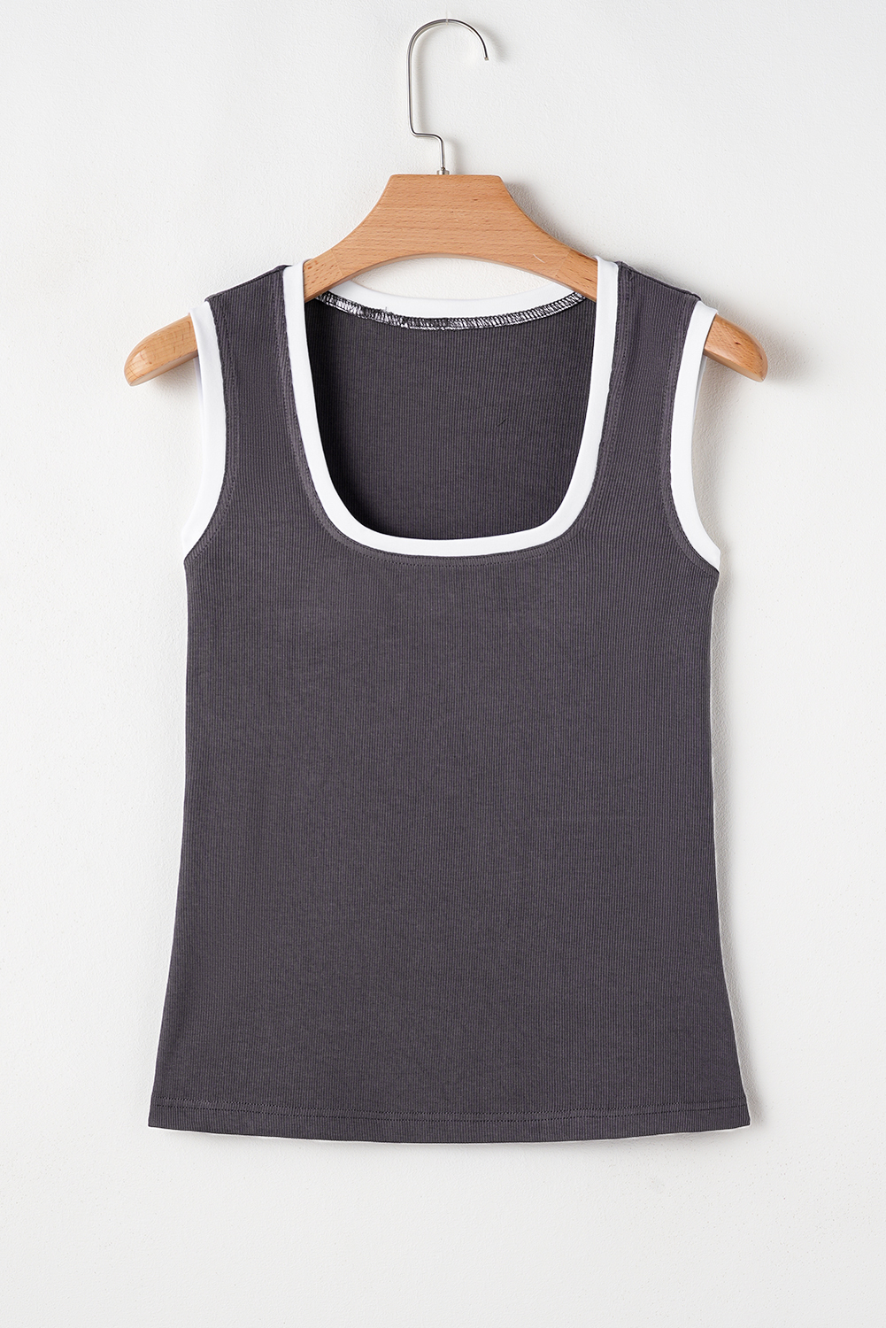 Carbon Grey Ribbed Knit Colorblock Edge U Neck Slim Fit Tank Top