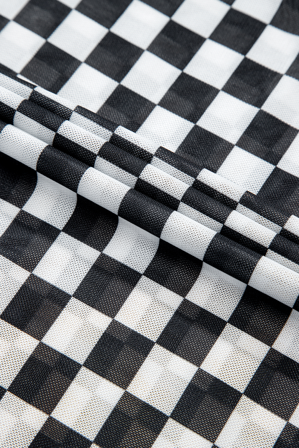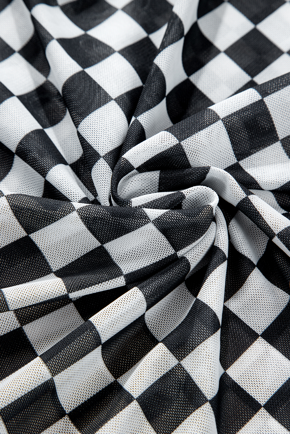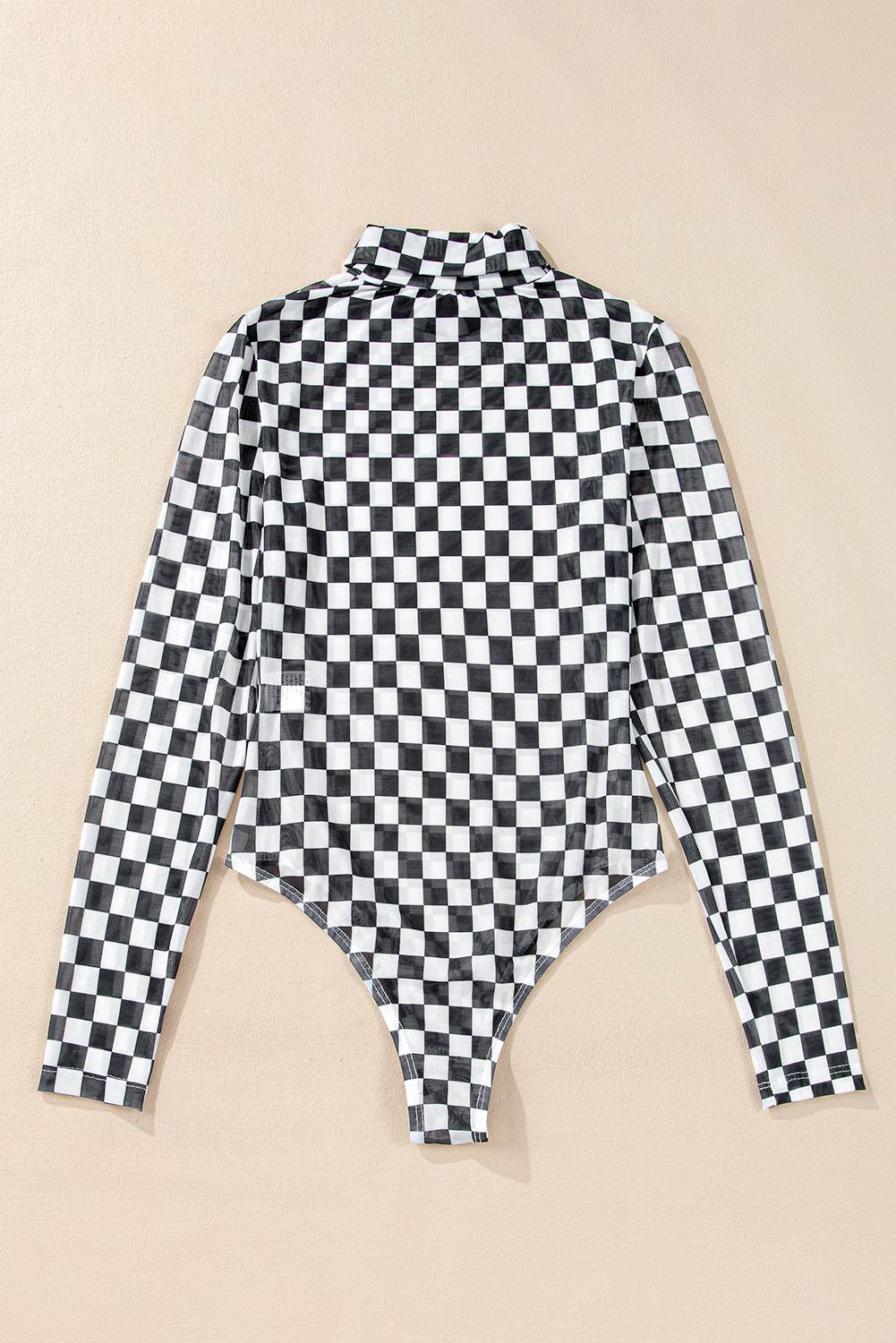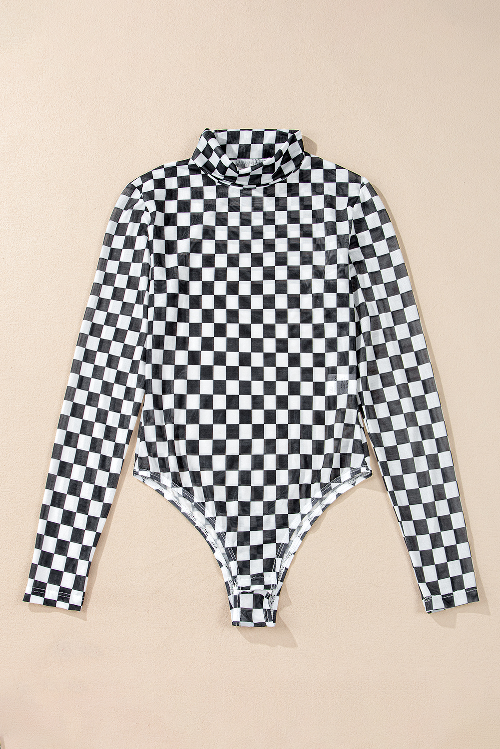Black Checkered Printed Long Sleeve High Neck Bodysuit