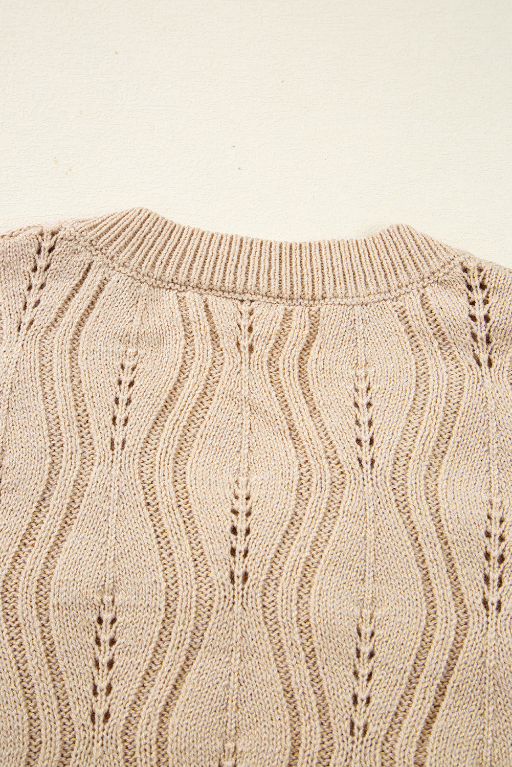 Smoke Gray Pearl Beaded Pointelle Knit V Neck Lace Patchwork Sleeve Sweater