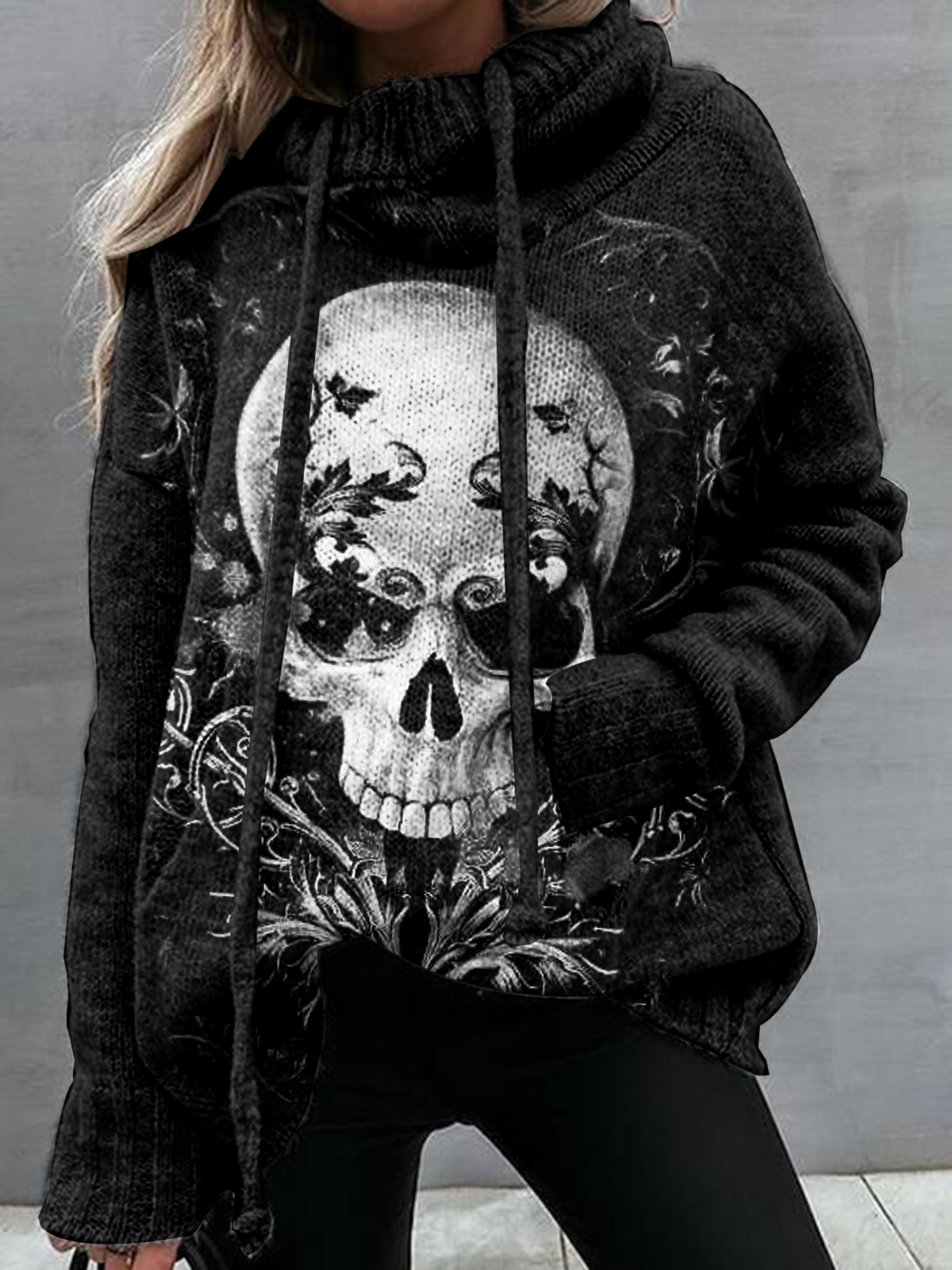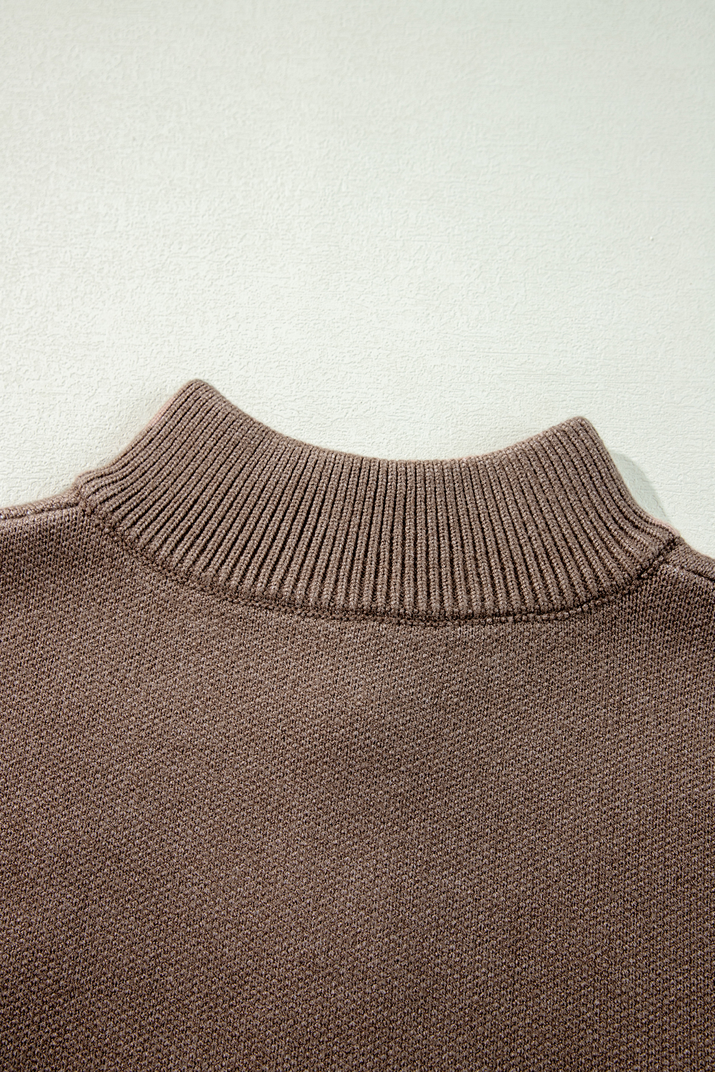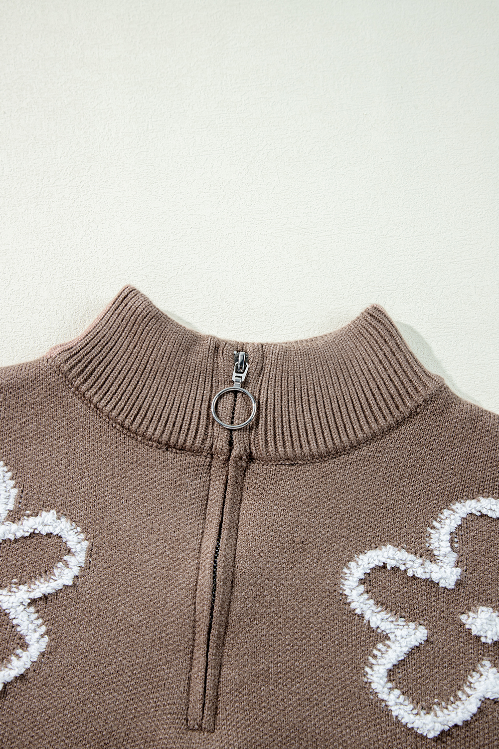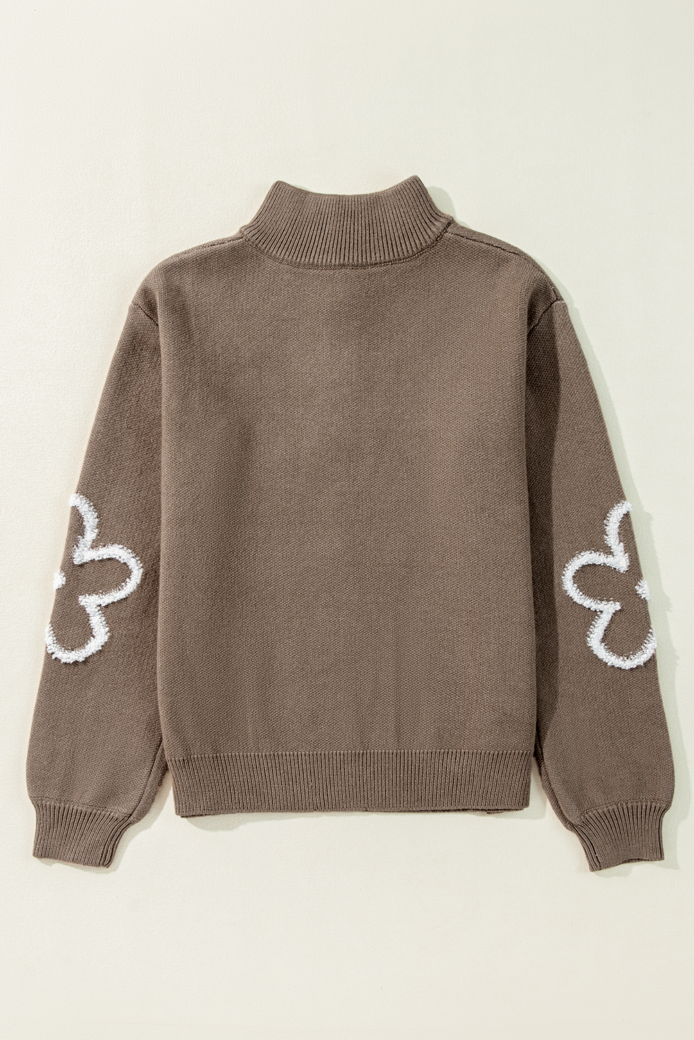 Parchment Contrast Flower Half Zipper Stand Neck Sweater