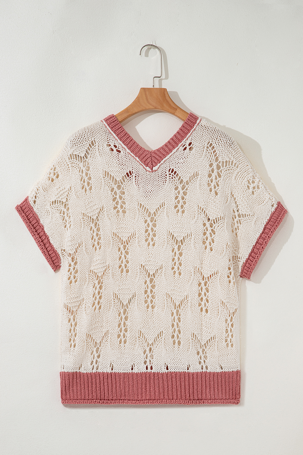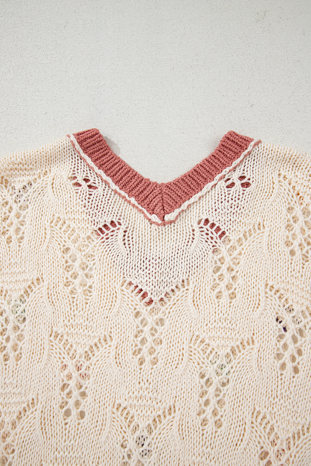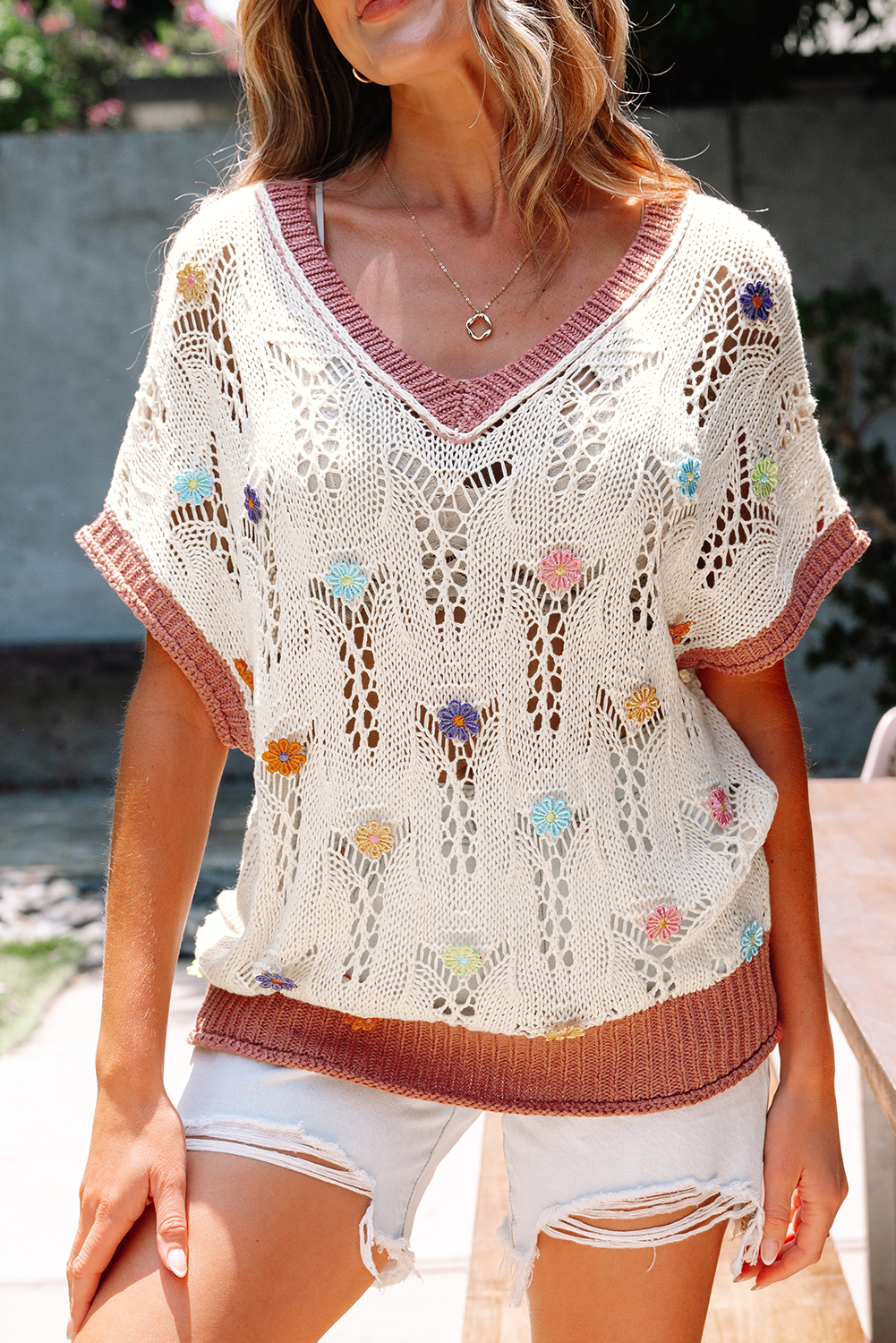 Delicacy Embroidered Flowers Colorblock Edge Hollowed Sweater