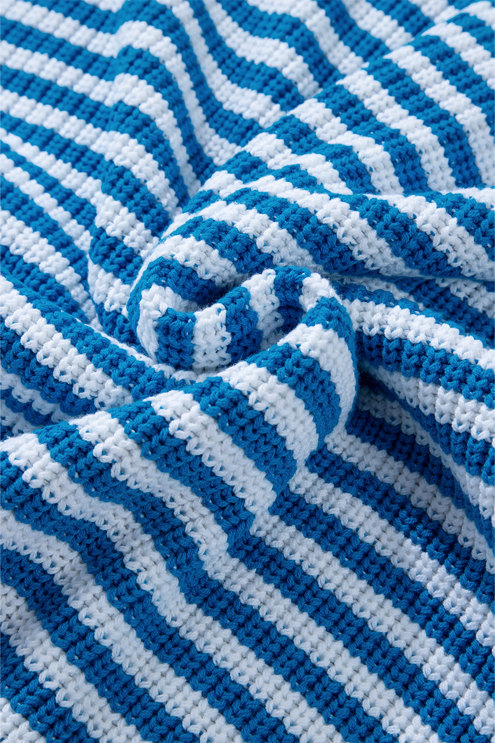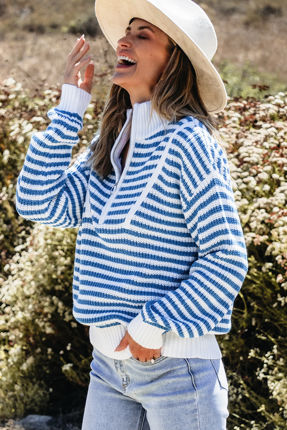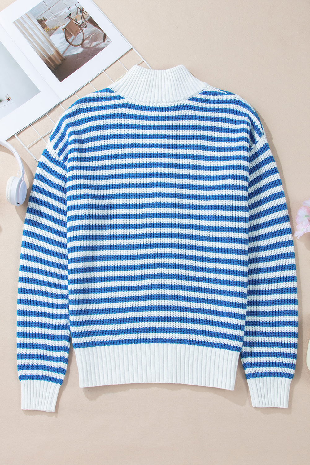 Sky Blue Stripe Zip up Collar Drop Shoulder Sweater