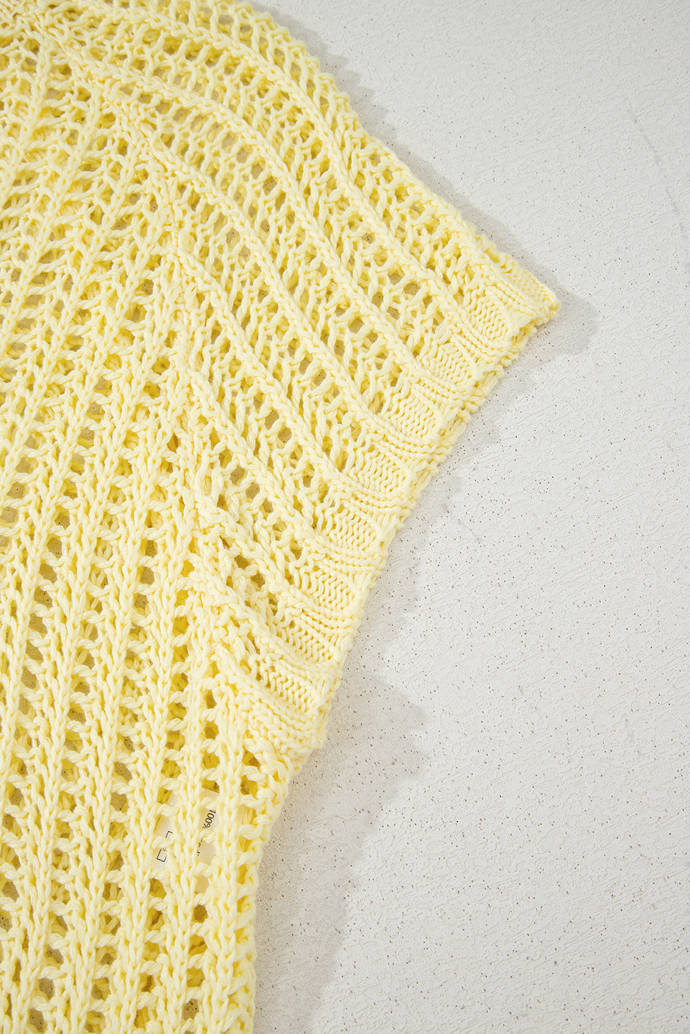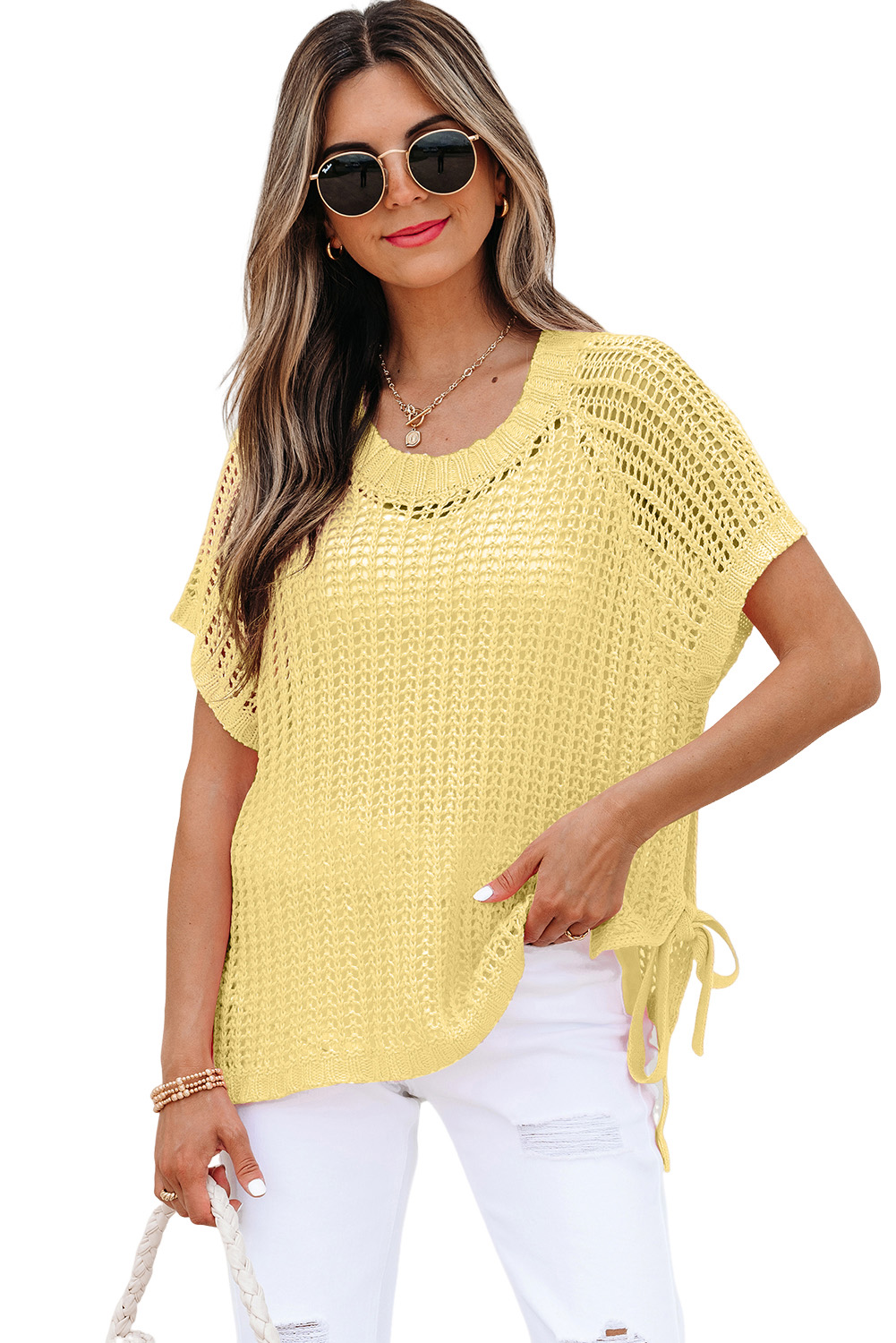 Yellow Cream Hollow-out Crochet Side Tied Short Sleeve Sweater