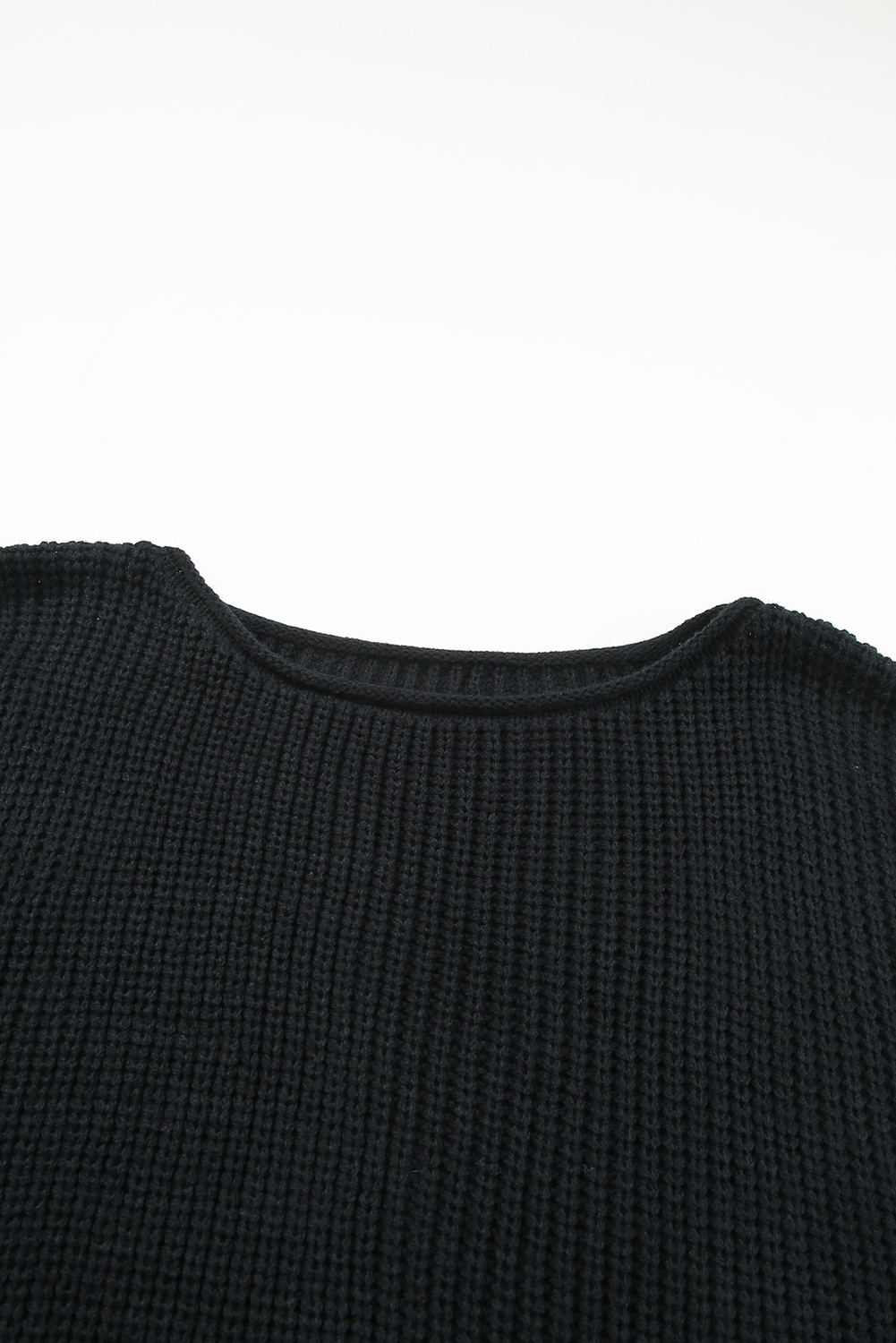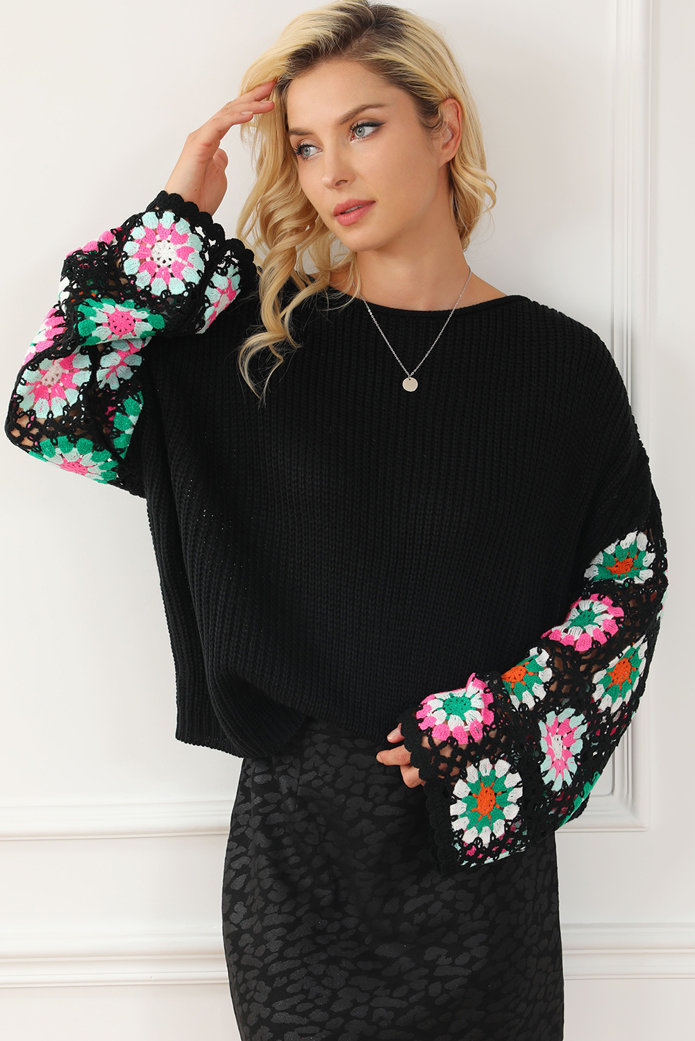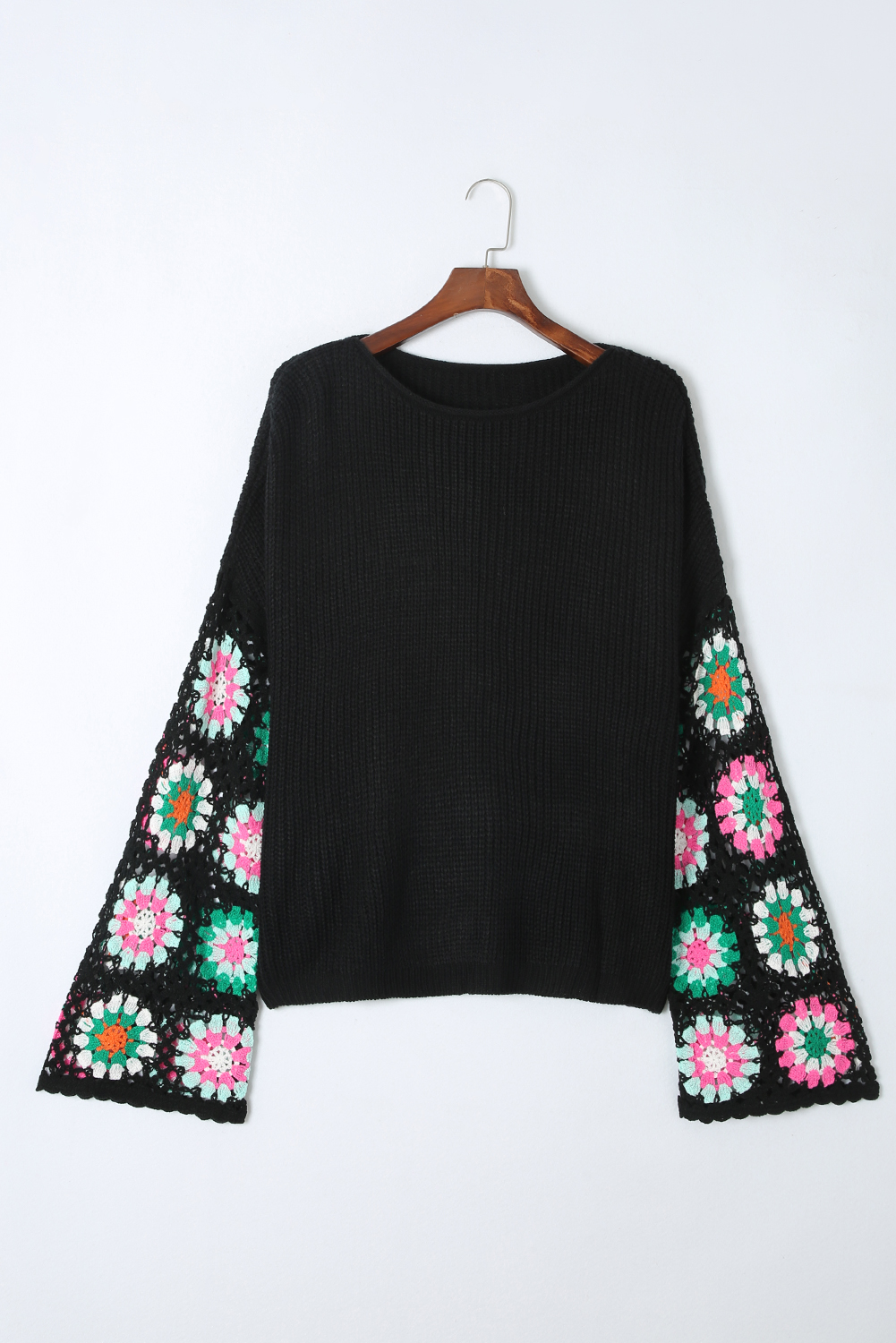 Black Floral Crochet Bell Sleeve Loose Sweater