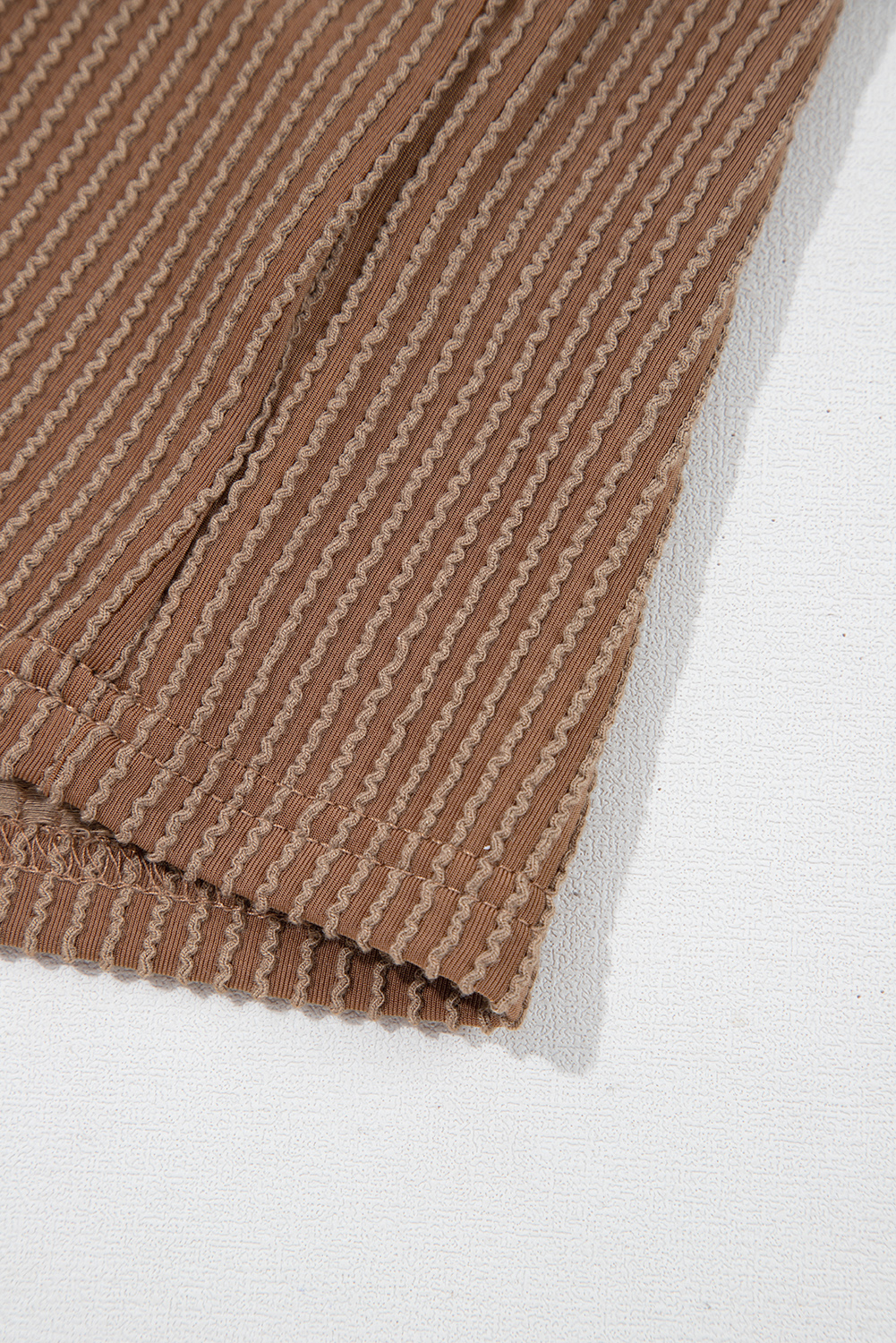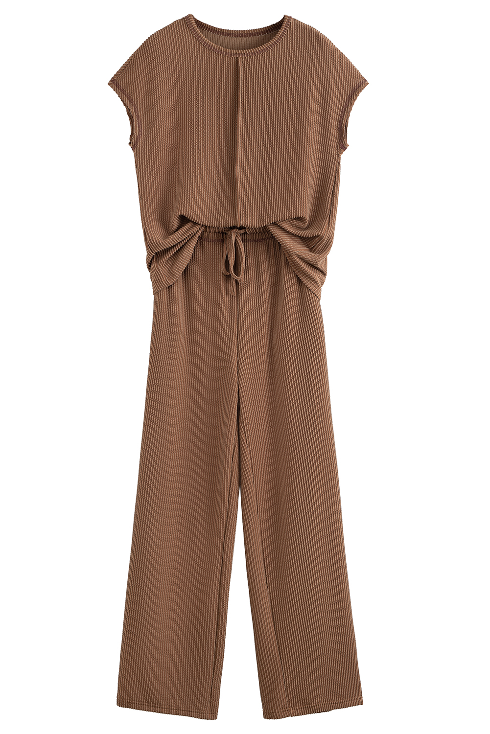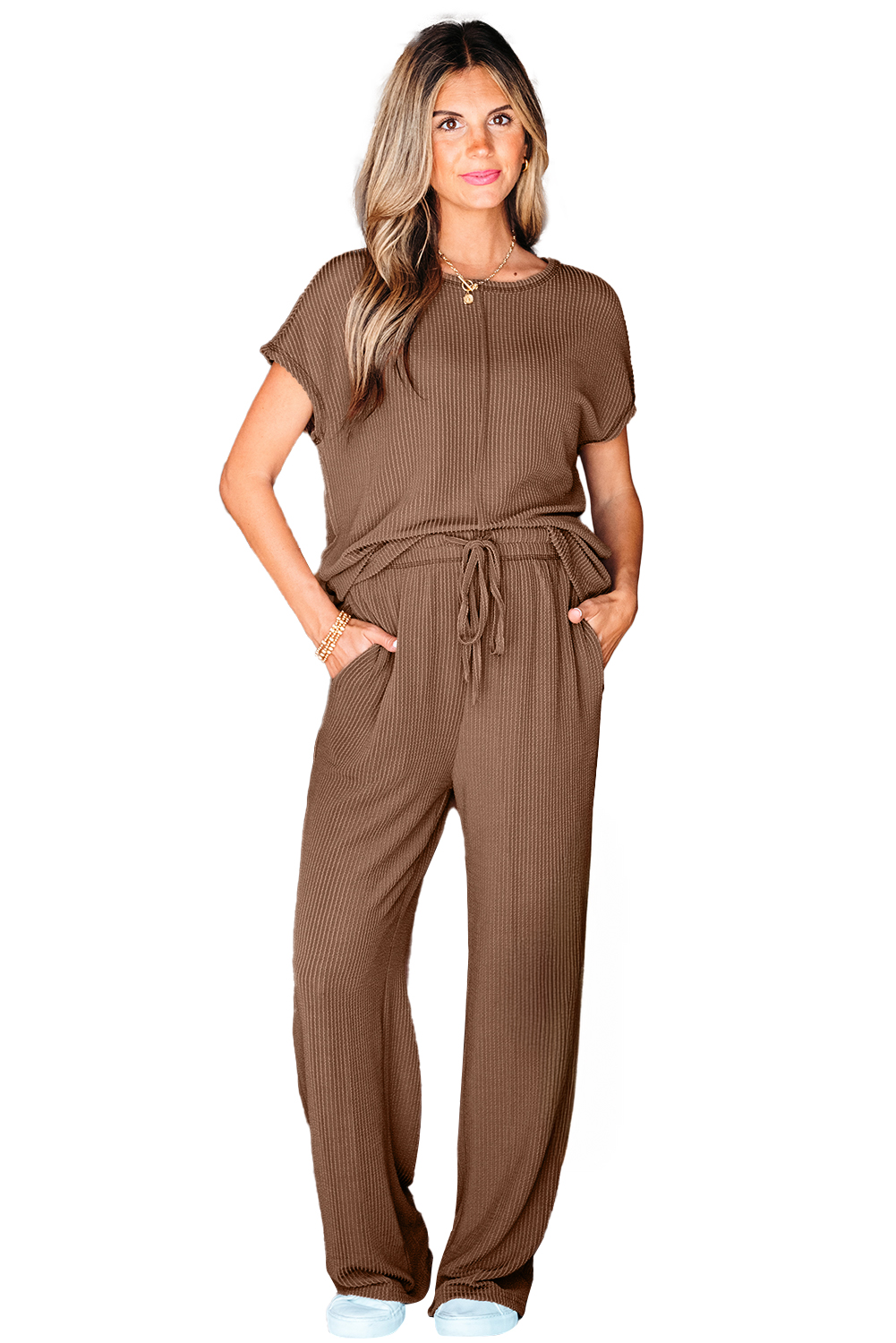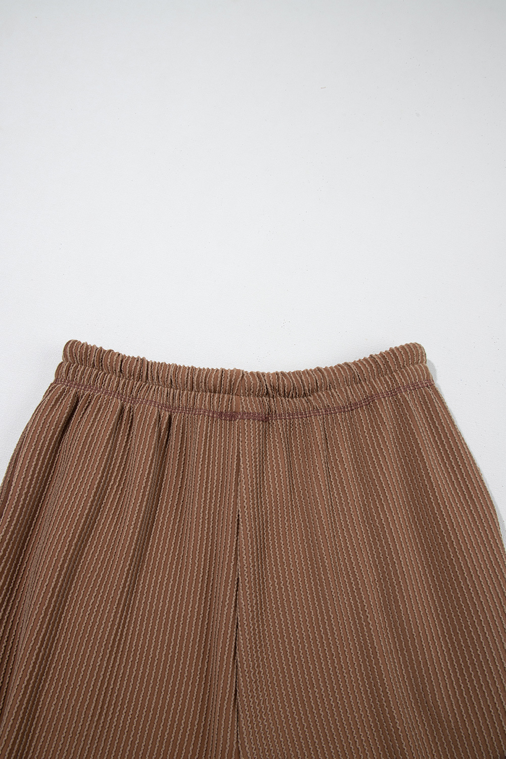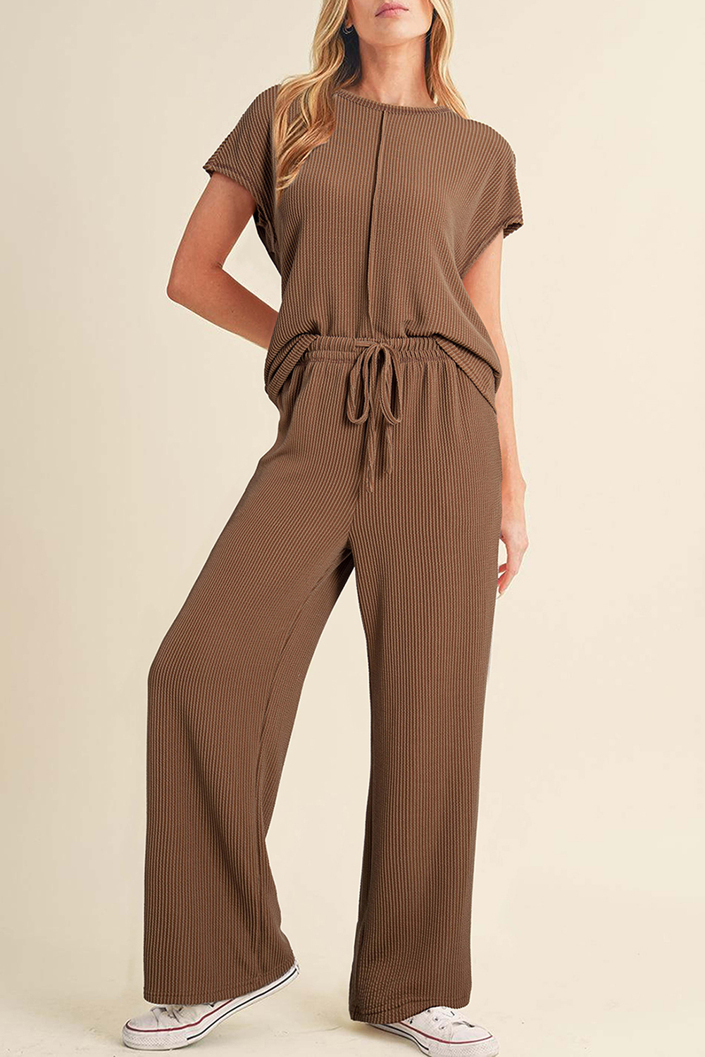 Coffee Solid Color Corded Short Sleeve Top and Casual Pants Set