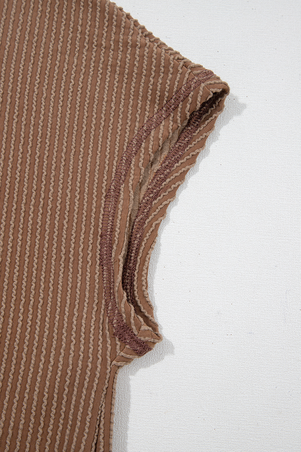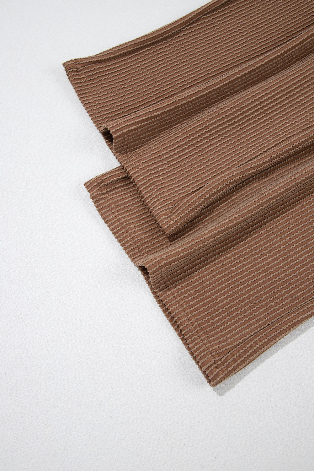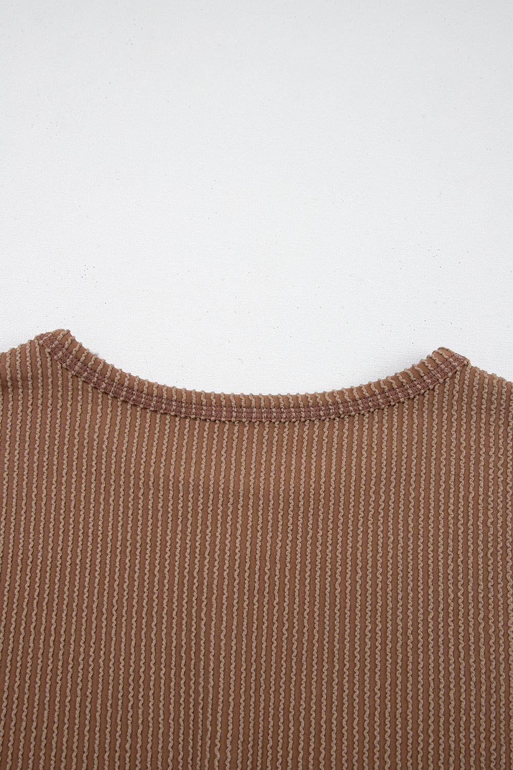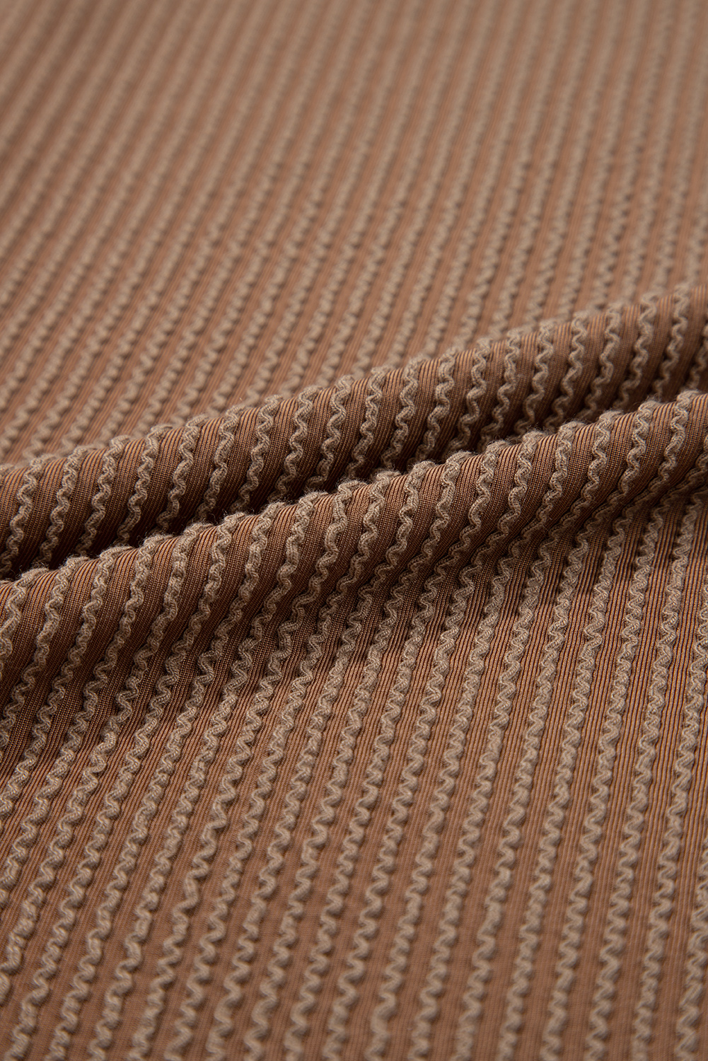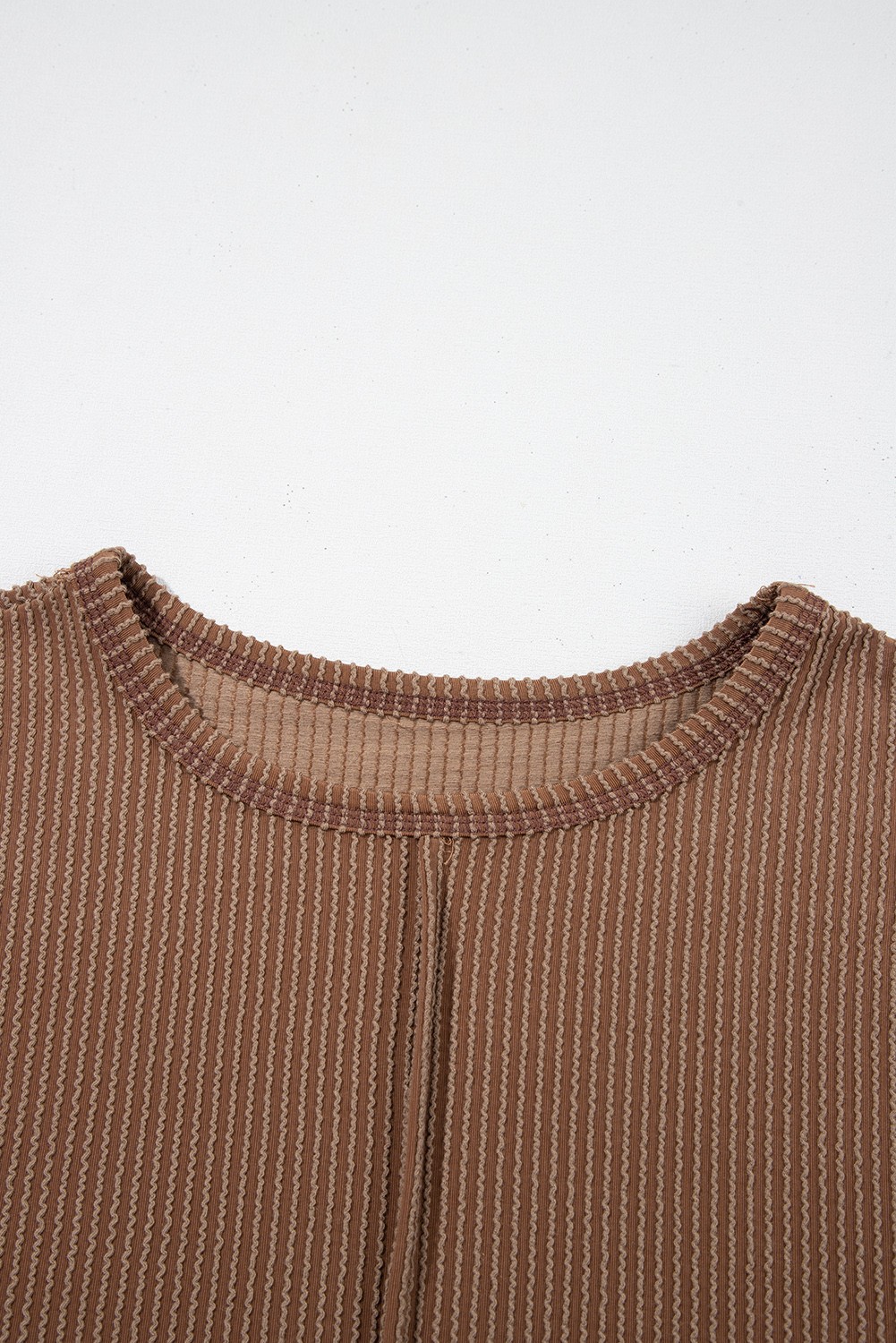 Coffee Solid Color Corded Short Sleeve Top and Casual Pants Set