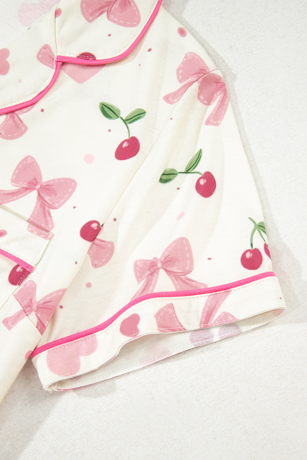 Beige Bow Fruit Print Contrast Pipping Short Pajamas Set
