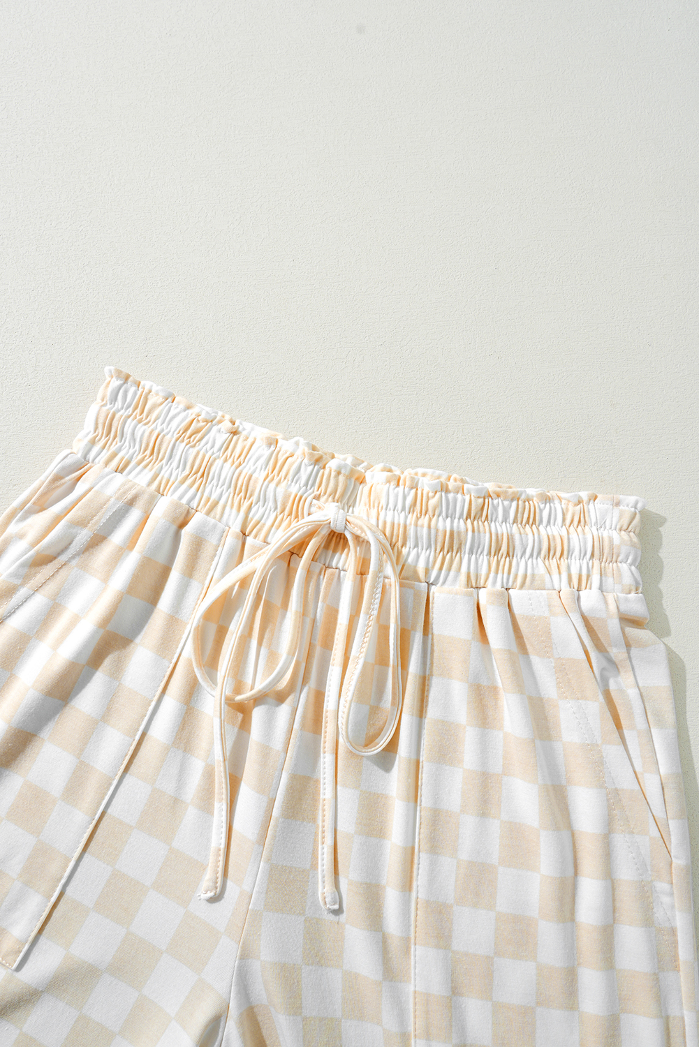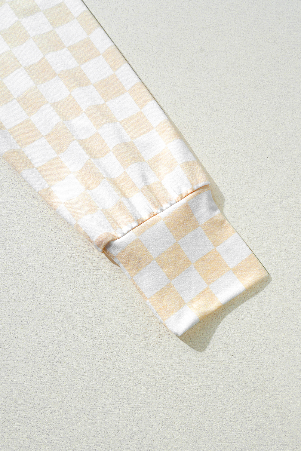 Beige Checkered Print Long Sleeve Top and Pants Lounge Set