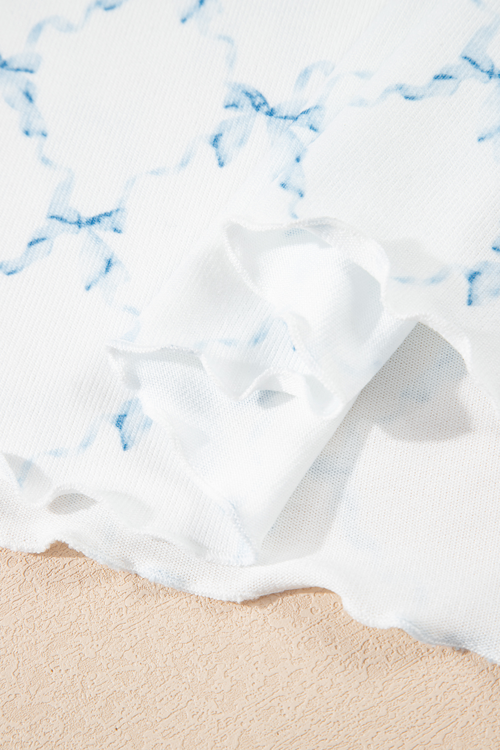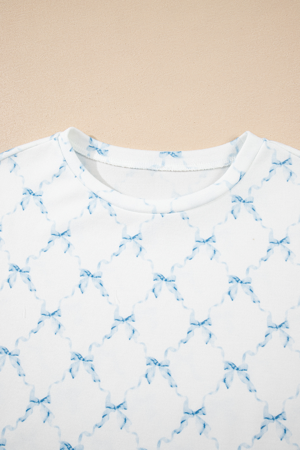 Sky Blue Bow Knot Geometric Print Lettuce Trim Two Piece Lounge Set