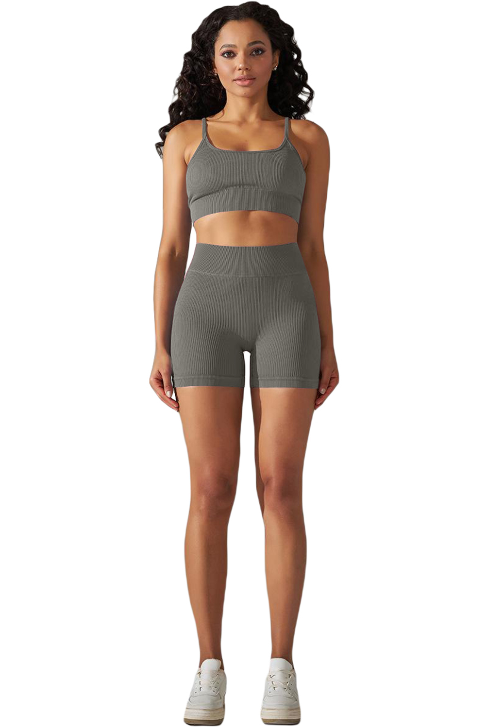 Light Grey Spaghetti Straps Bra and High Waist Shorts Workout Set