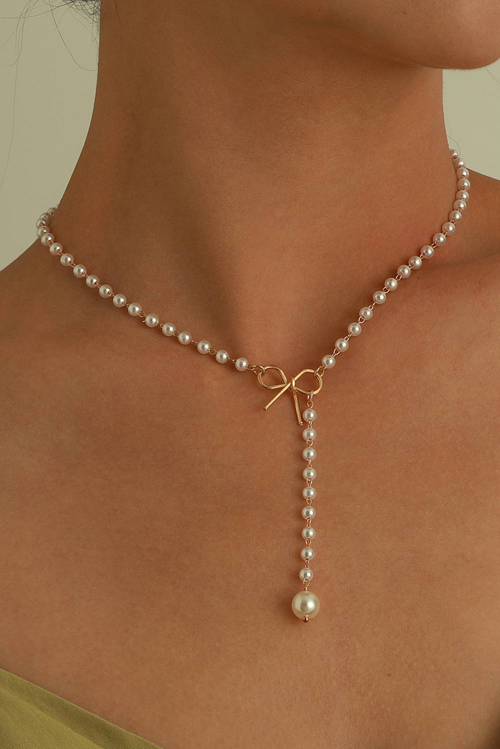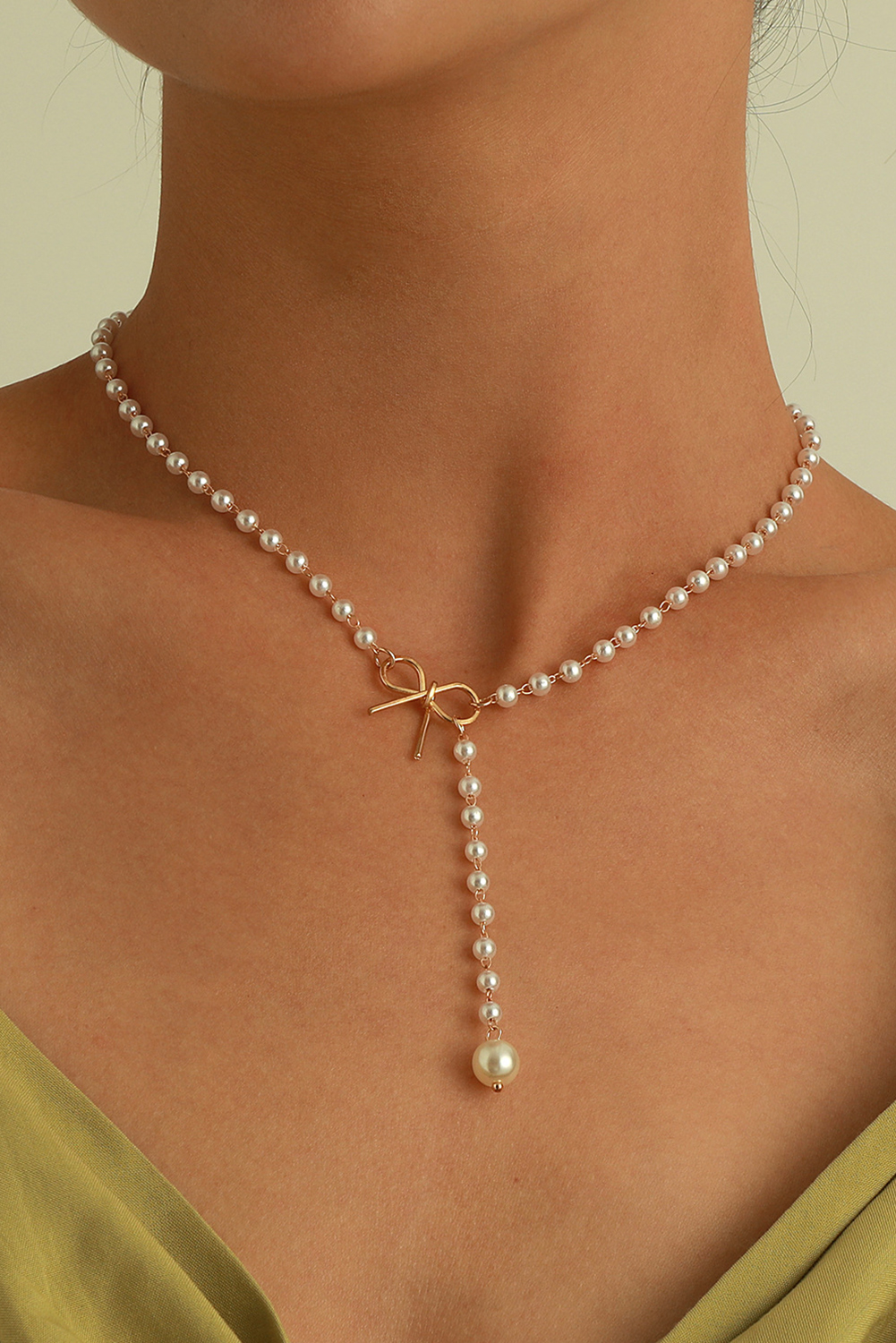 Gold Plated Bow Decor Pearl Chaining Necklace