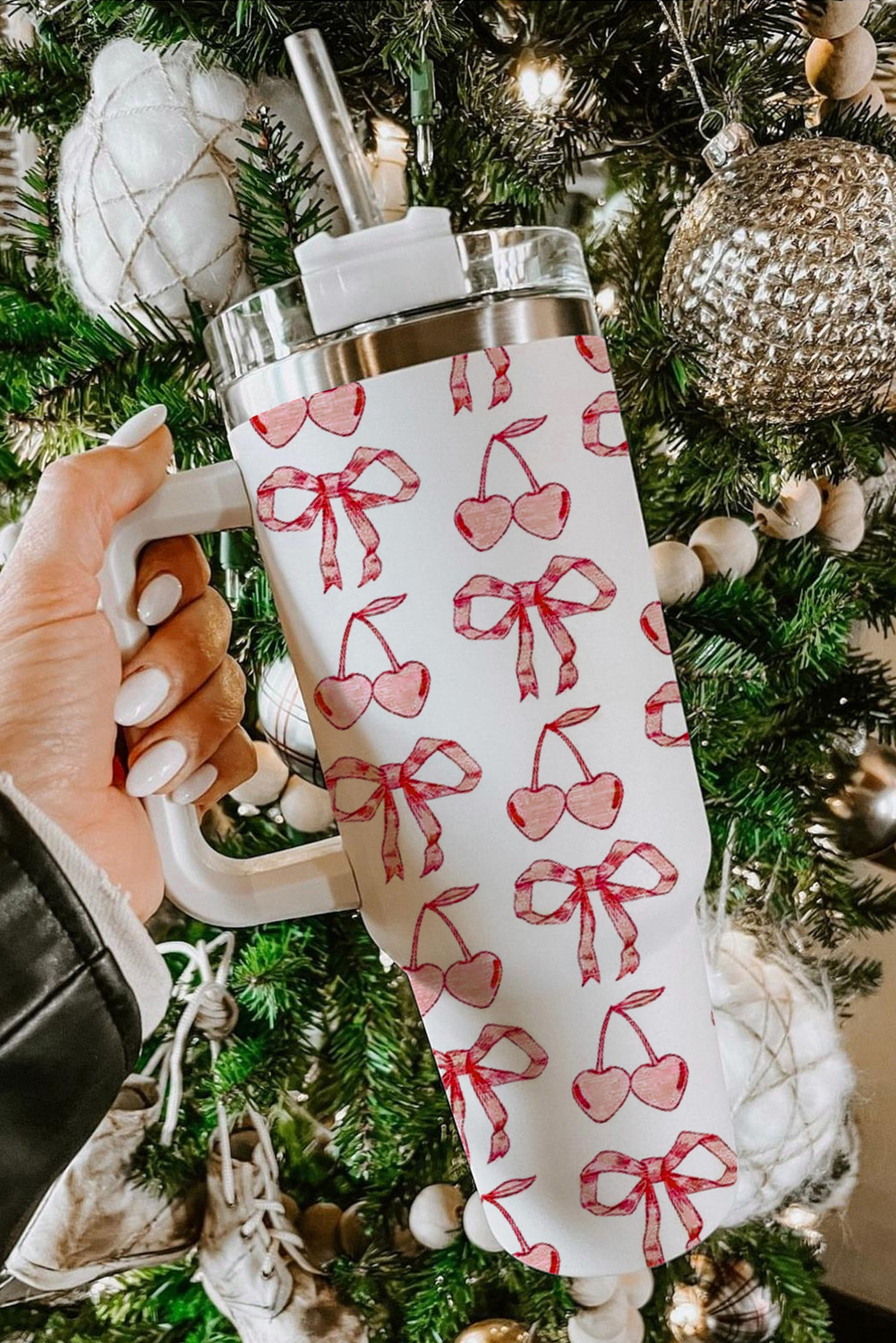 White Cherry Bowknot Stylish Large Tumbler with Handle 40oz