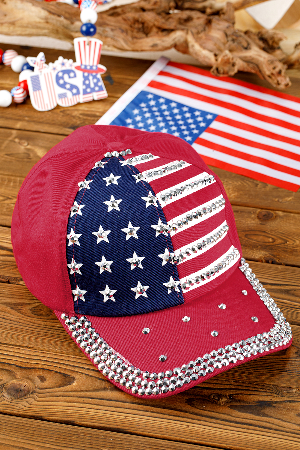Fiery Red American Flag Rhinestone Decor Baseball Cap