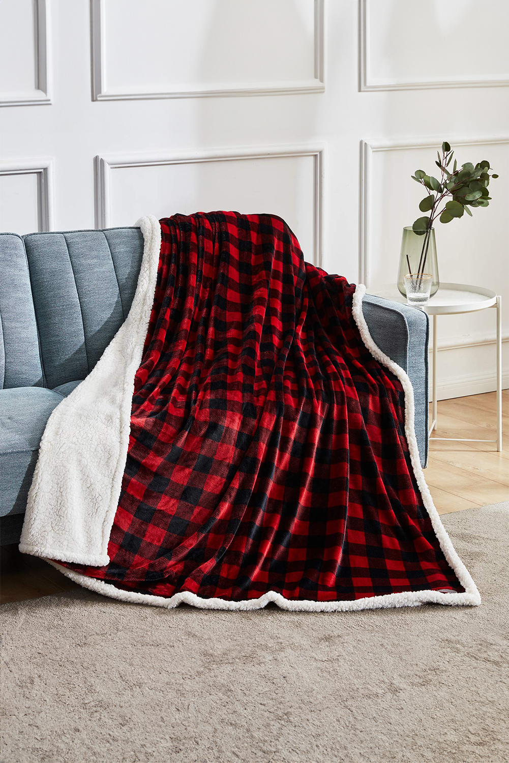 Fiery Red Buffalo Plaid Print Sherpa Large Throw Blanket