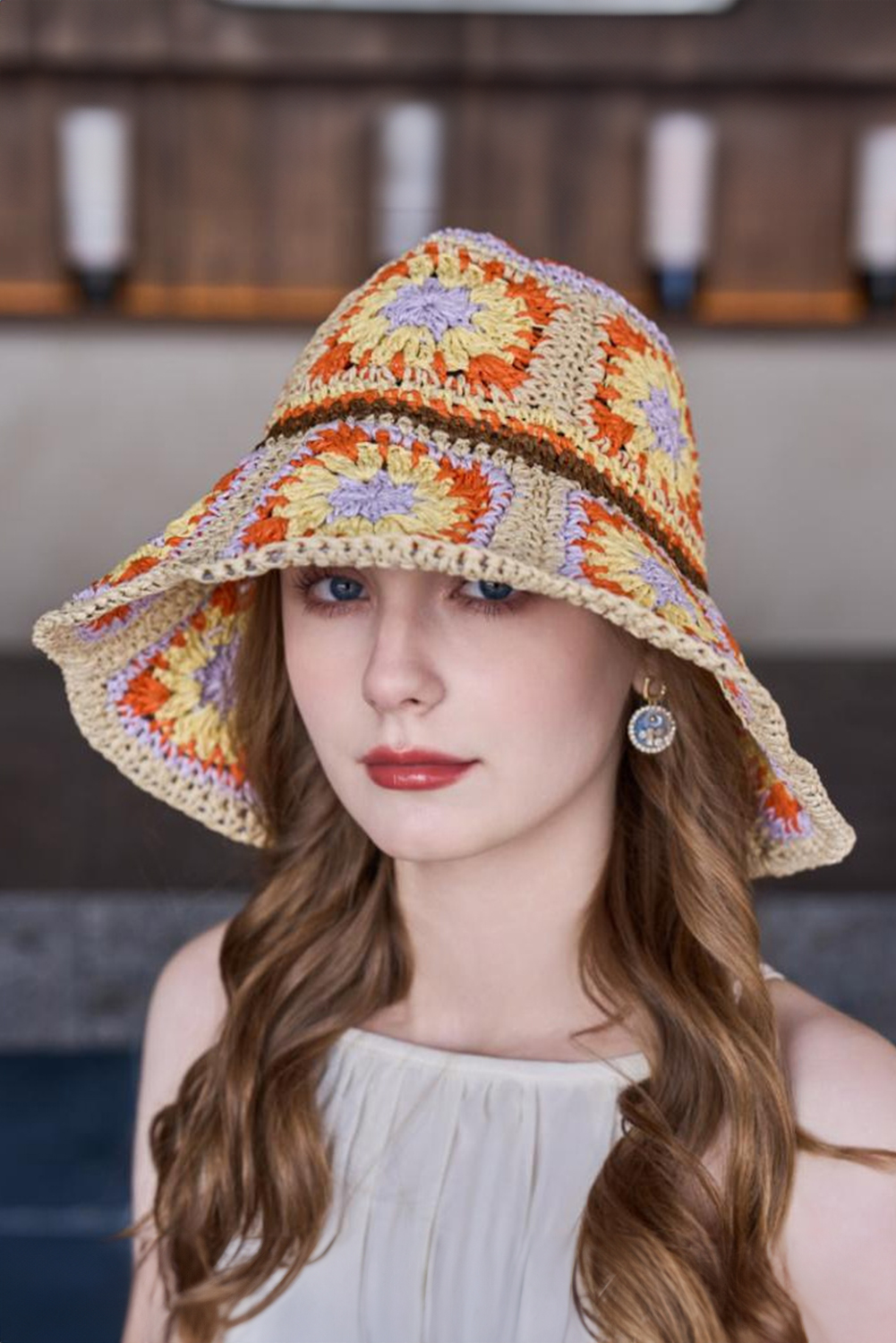 Beige Boho Flower Crochet Wide Brim Buckle Hat