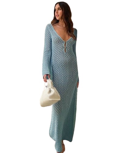 Material: Soft breathable crochet-knit fabric Design: Long sleeves with deep V-neck and front tie detail Fit: Relaxed fit, floor-length silhouette Style: Boho-inspired, sheer and elegant Occasion: Ideal for beach days, poolside lounging, resort vacations Features: See-through mesh design, stretchy fabric, pull-on style