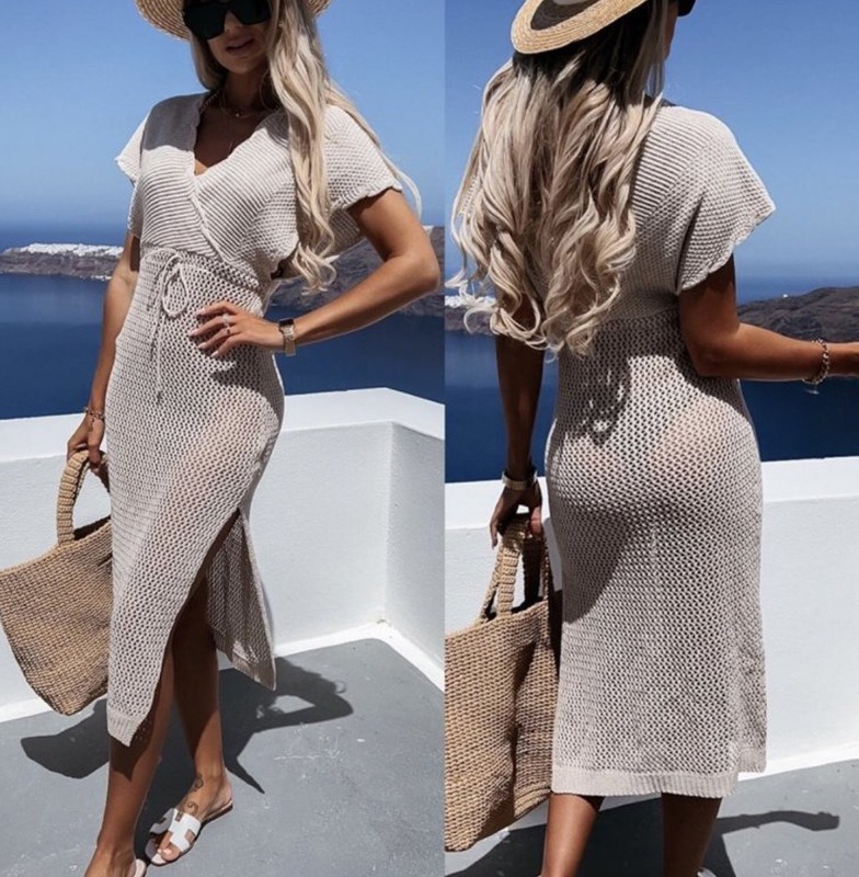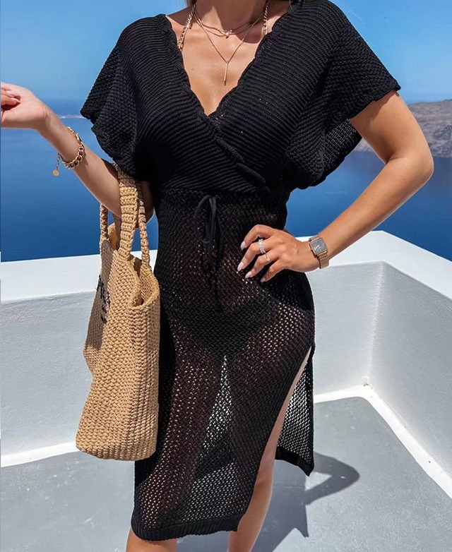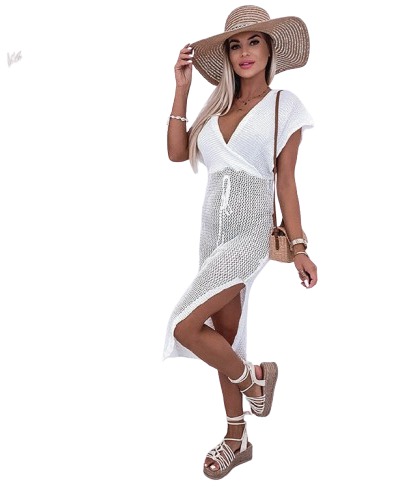 Material: Soft, breathable crochet-knit fabric Design: Wrap-front style with adjustable waist tie and side slit Fit: Relaxed silhouette with flattering cinched waist Function: Ideal as a swimwear cover-up or casual summer dress Style: Lightweight open-weave texture with midi length Features: Cap sleeves and airy construction for hot climates