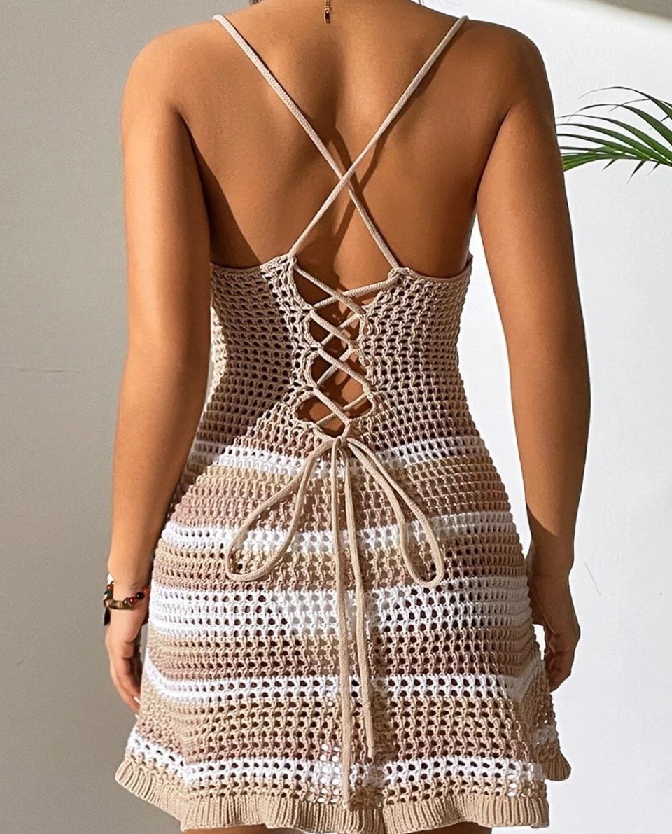 Material: 100% acrylic yarn (hand-crocheted) Design: Sleeveless with twist-front bust and keyhole cutout Back Detail: Crisscross lace-up open back for adjustable fit Fit: Bodycon silhouette, flared hemline for comfort Style: Bohemian-inspired for beach, resort, or summer outings Closure: Pull-on style with tie-back adjustment Care Instructions: Hand wash cold, lay flat to dry Use: Ideal for swimwear cover-up, festivals, or tropical vacations Texture: Soft, breathable, and slightly stretchy knit Length: Mini dress with slight ruffle trim hem