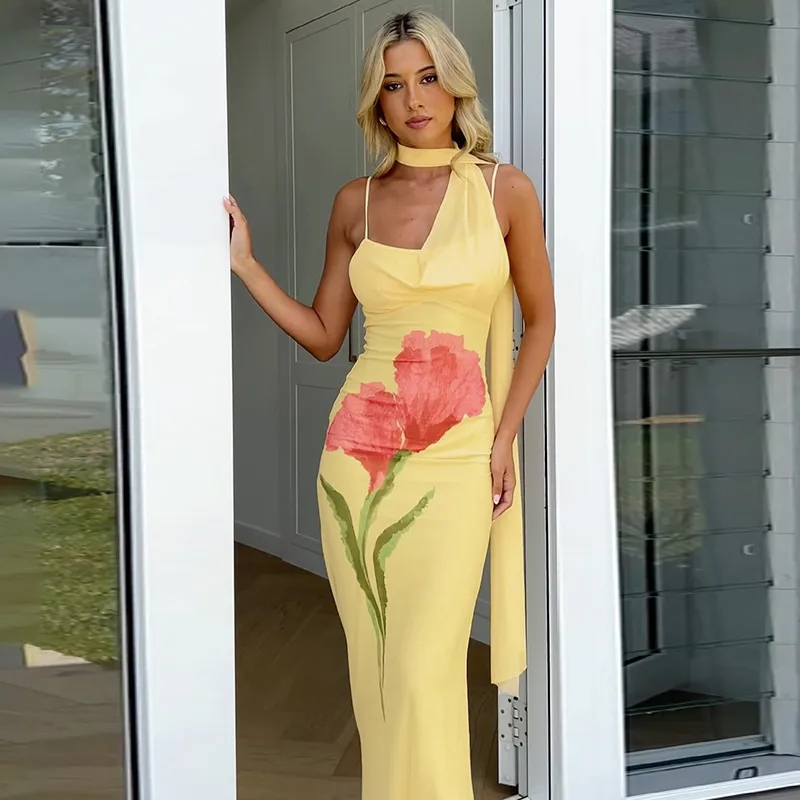 Wholesale Women's Sheath Dress Elegant Strap Sleeveless Flower Maxi Long Dress Holiday