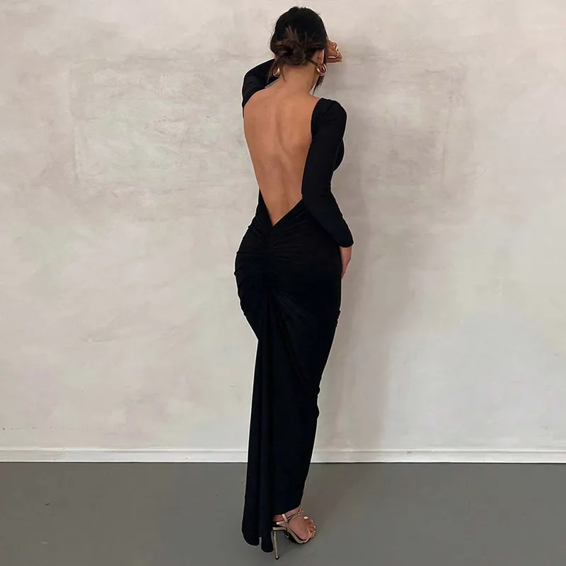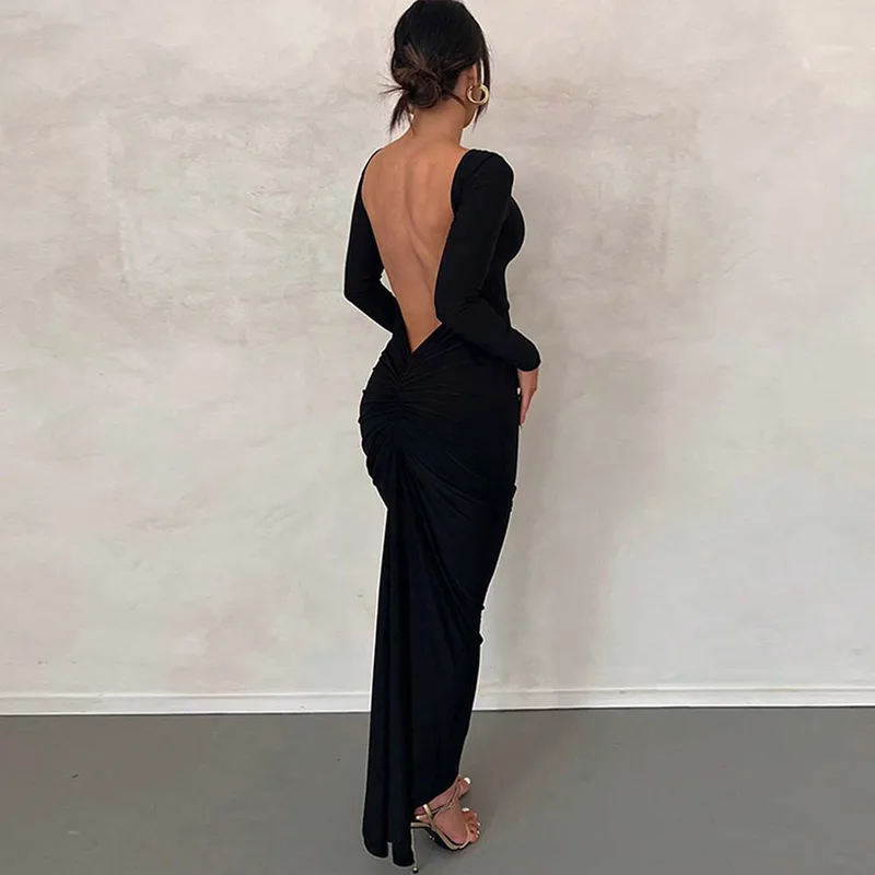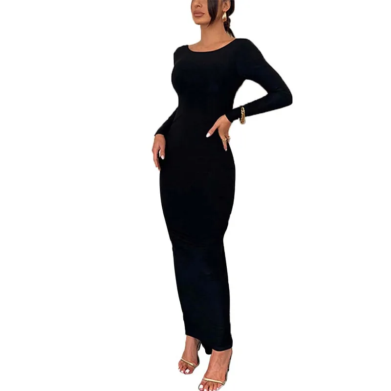 Wholesale Women's Sheath Dress Sexy Round Neck Backless Long Sleeve Solid Color Maxi Long Dress Cocktail Party