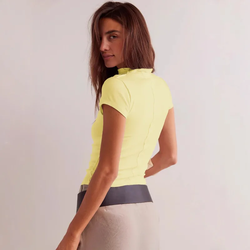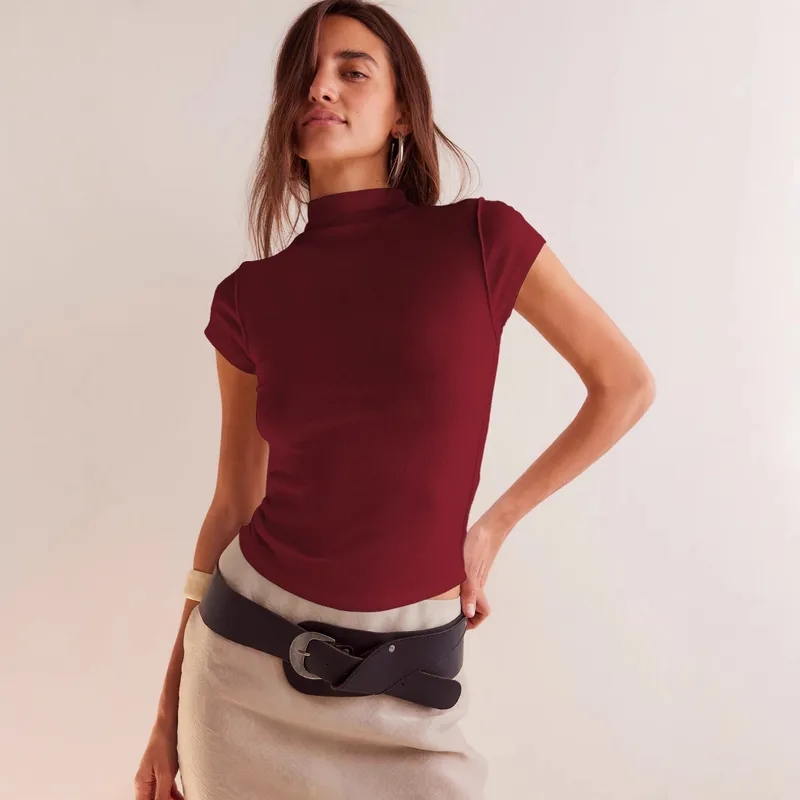 Wholesale Designed Women's Spring And Summer New Half-high Neck Elegant Fashion Basic Color Orthogonal Shoulder Short-sleeved T-shirt Top