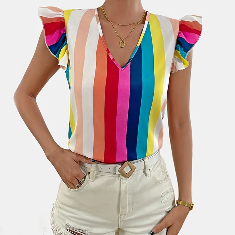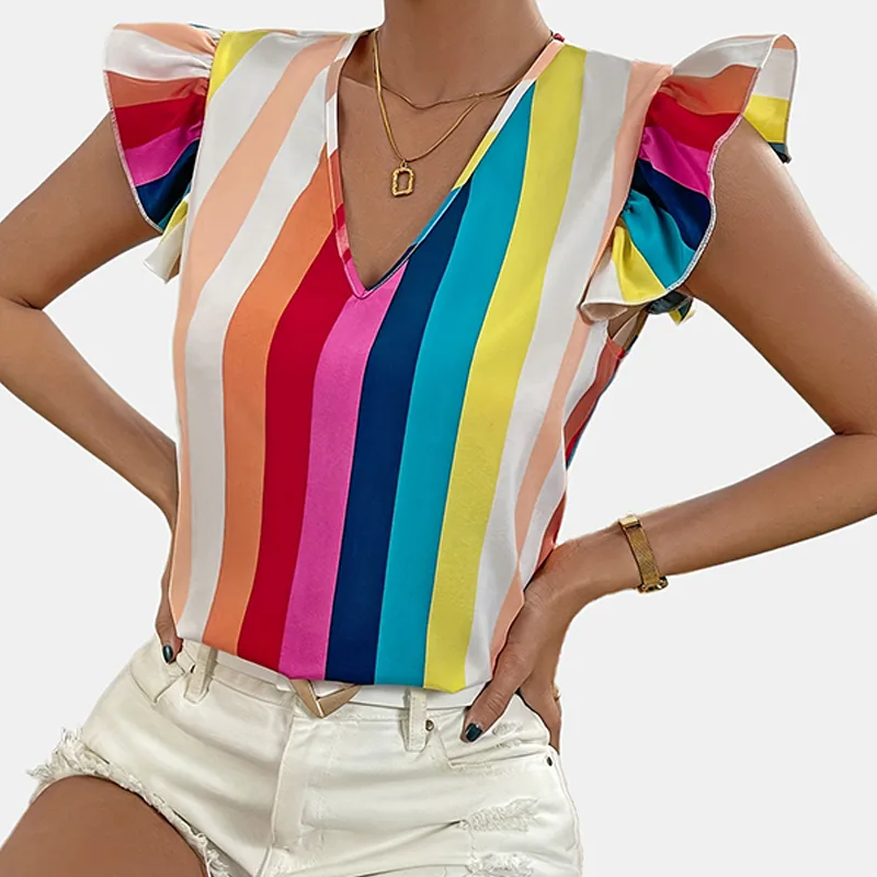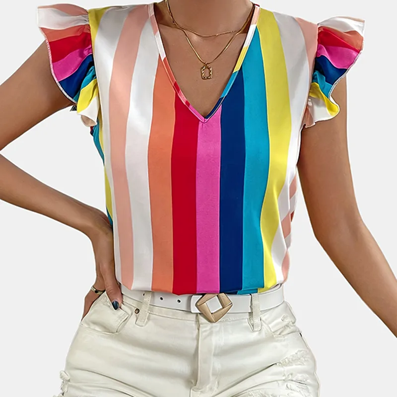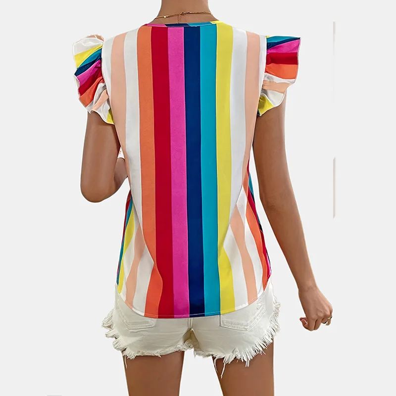 Wholesale women's blouse short sleeve blouses ruffles casual rainbow stripe