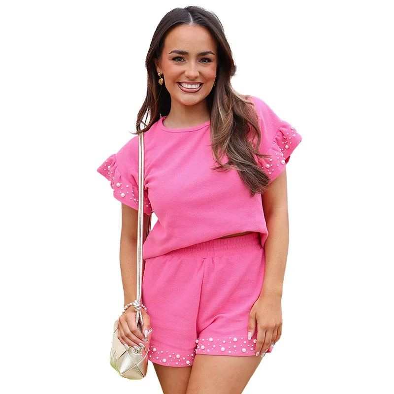 Wholesale Daily Women's Casual Solid Color Spandex Polyester Pearl Shorts Co-ord Set Shorts Sets