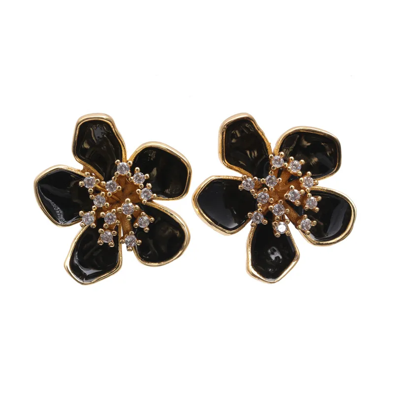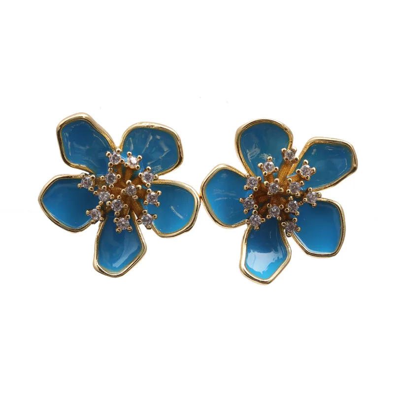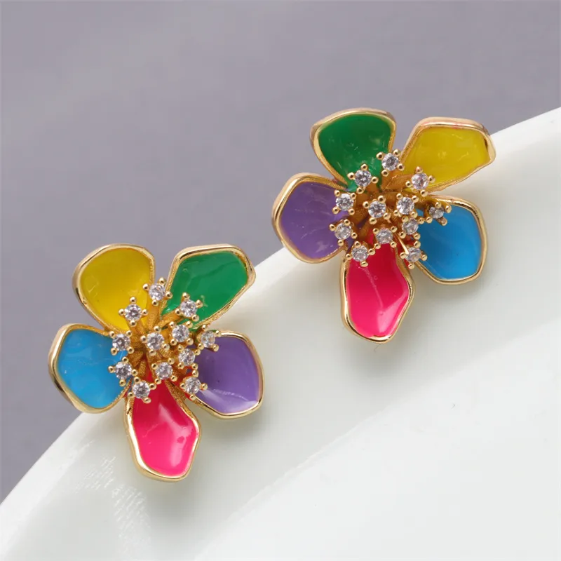 Wholesale 1 pair elegant flower petal enamel inlay copper zircon gold plated ear studs