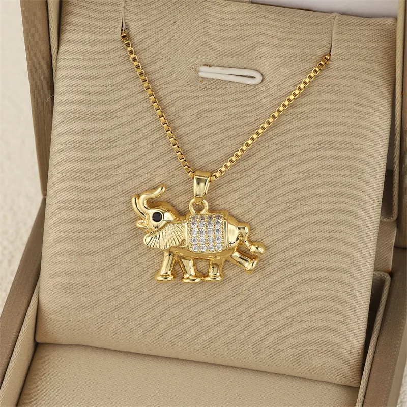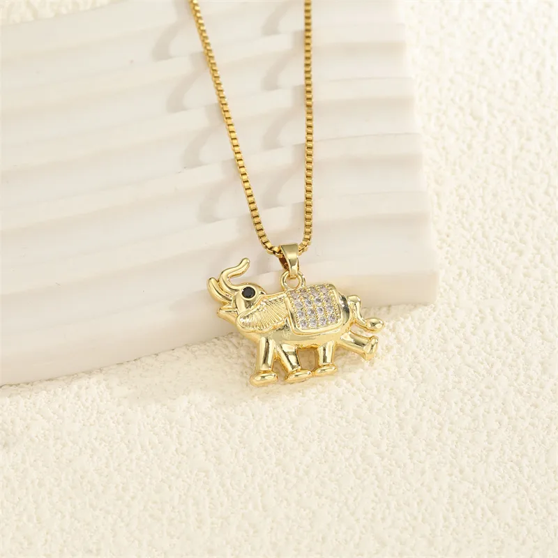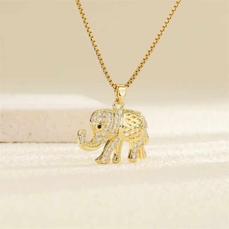 Wholesale 201 Stainless Steel Brass 18K Gold Plated Hollow Out Inlay Elephant Zircon Pendant Necklace