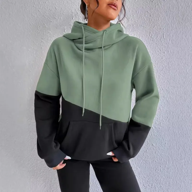 2024 Amazon Autumn New Color Block Stitching Kangaroo Pocket Drawstring Loose Casual Hooded Sweater Women's Top