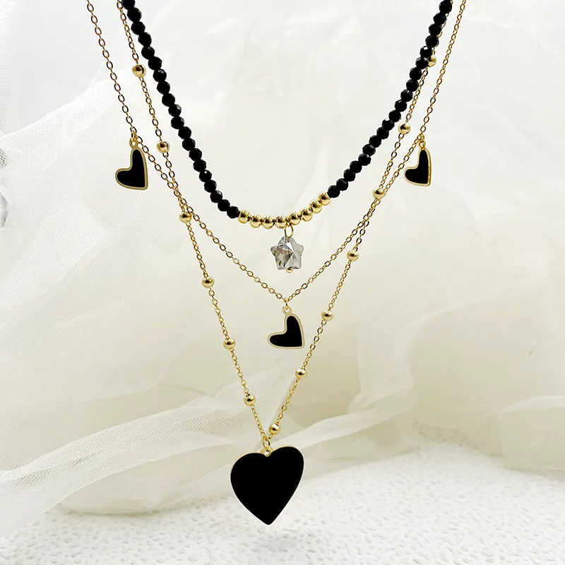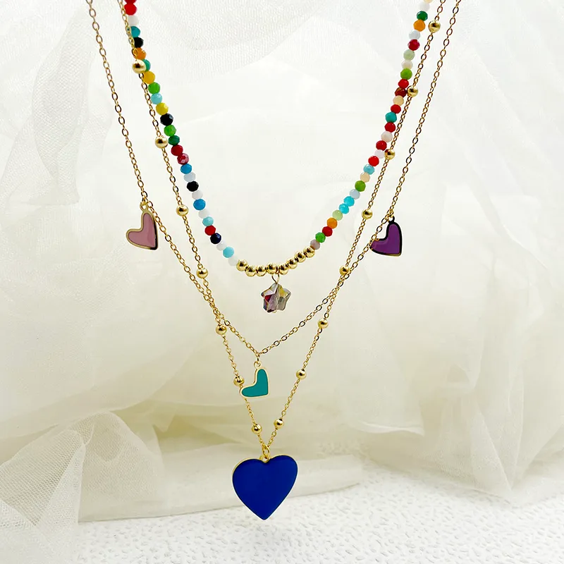 Wholesale 304 Stainless Steel Artificial Crystal Gold Plated Elegant French Style Layered Enamel Plating Heart Shape Three Layer Necklace