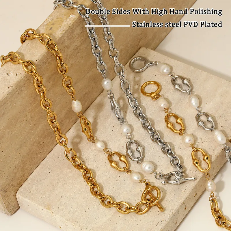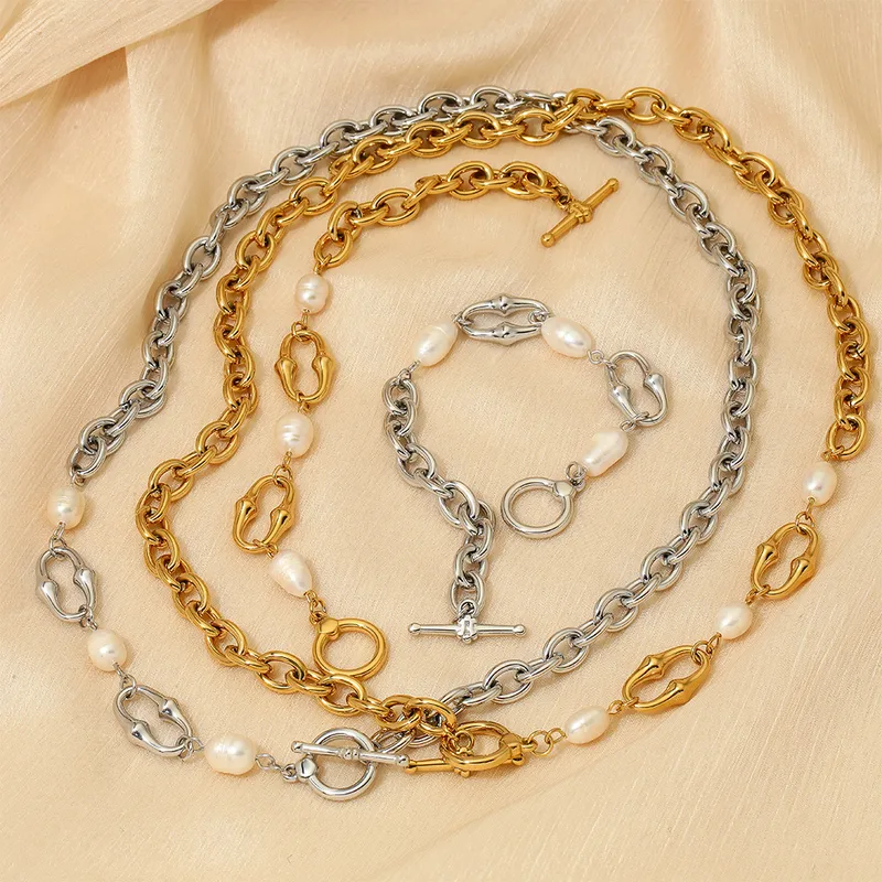 Wholesale 304 Stainless Steel Freshwater Pearl 16K Gold Plated White Gold Plated Gold Plated IG Style Simple Style Classic Style Polishing Plating Solid Color Bracelets Necklace