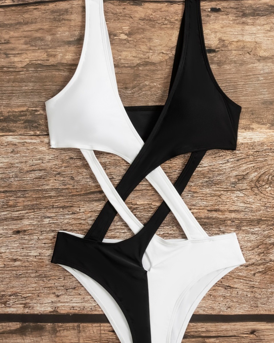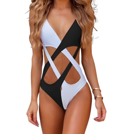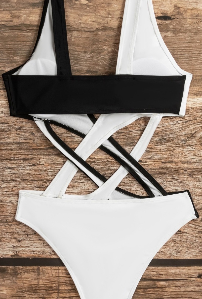 Material: 82% Nylon, 18% Spandex Design: Colorblock black and white design for a modern, edgy aesthetic Style: Asymmetrical one-shoulder cut with dramatic front and side cutouts Detail: Double crisscross straps across the front for added visual interest Coverage: Moderate back coverage with a high-cut leg for elongating effect Fit: Stretchy and form-fitting; contours comfortably to body shape Occasion: Ideal for pool parties, beach vacations, and resort wear Care: Hand wash cold, line dry in shade