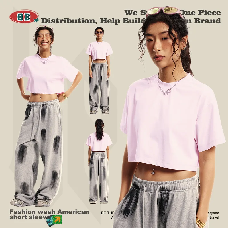 Wholesale BE Women's Spring and Summer Fashion Brand New Navel Top Spice Girl Clothes Loose Short Sports Short-sleeved T-shirt for Women