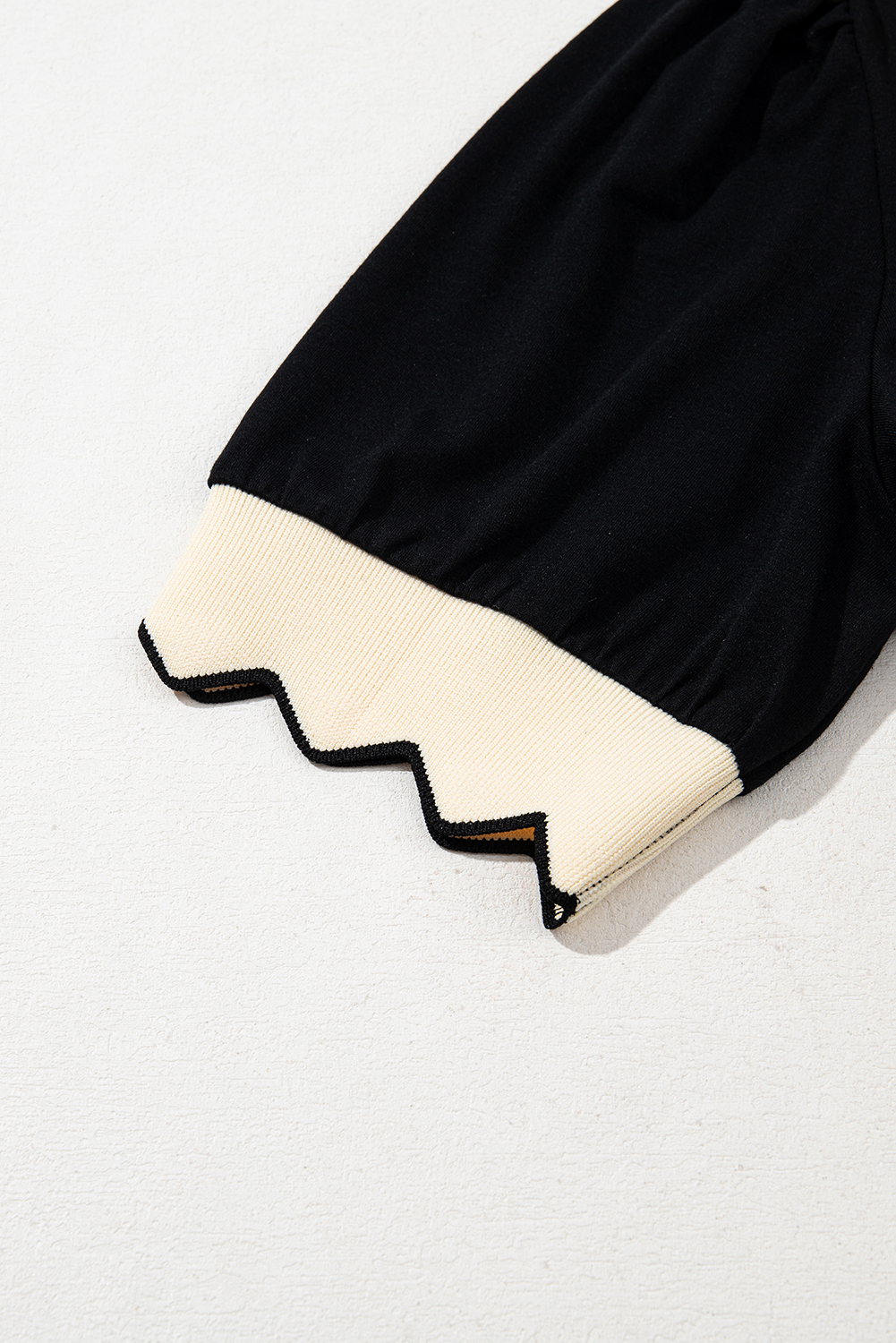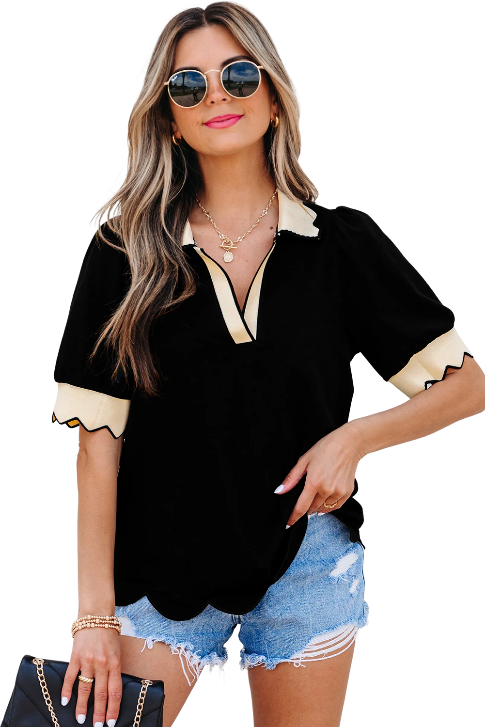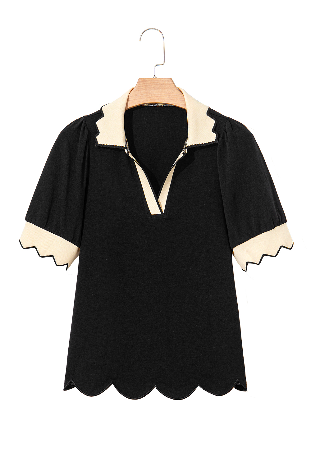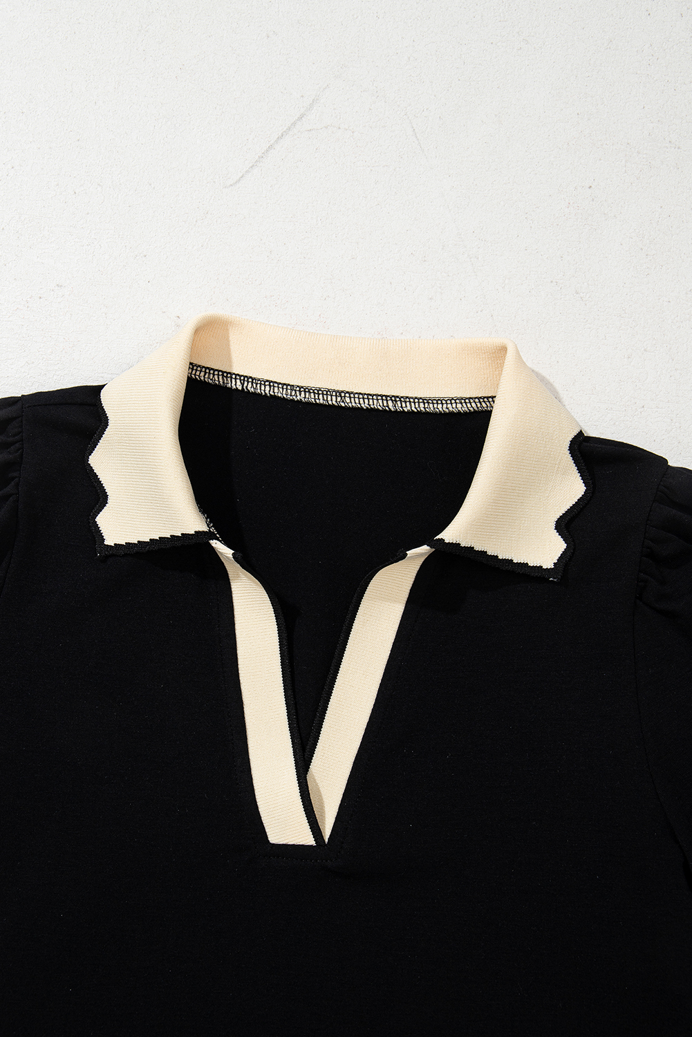 Black Color Contrast Collared V Neck Puff Sleeve Blouse