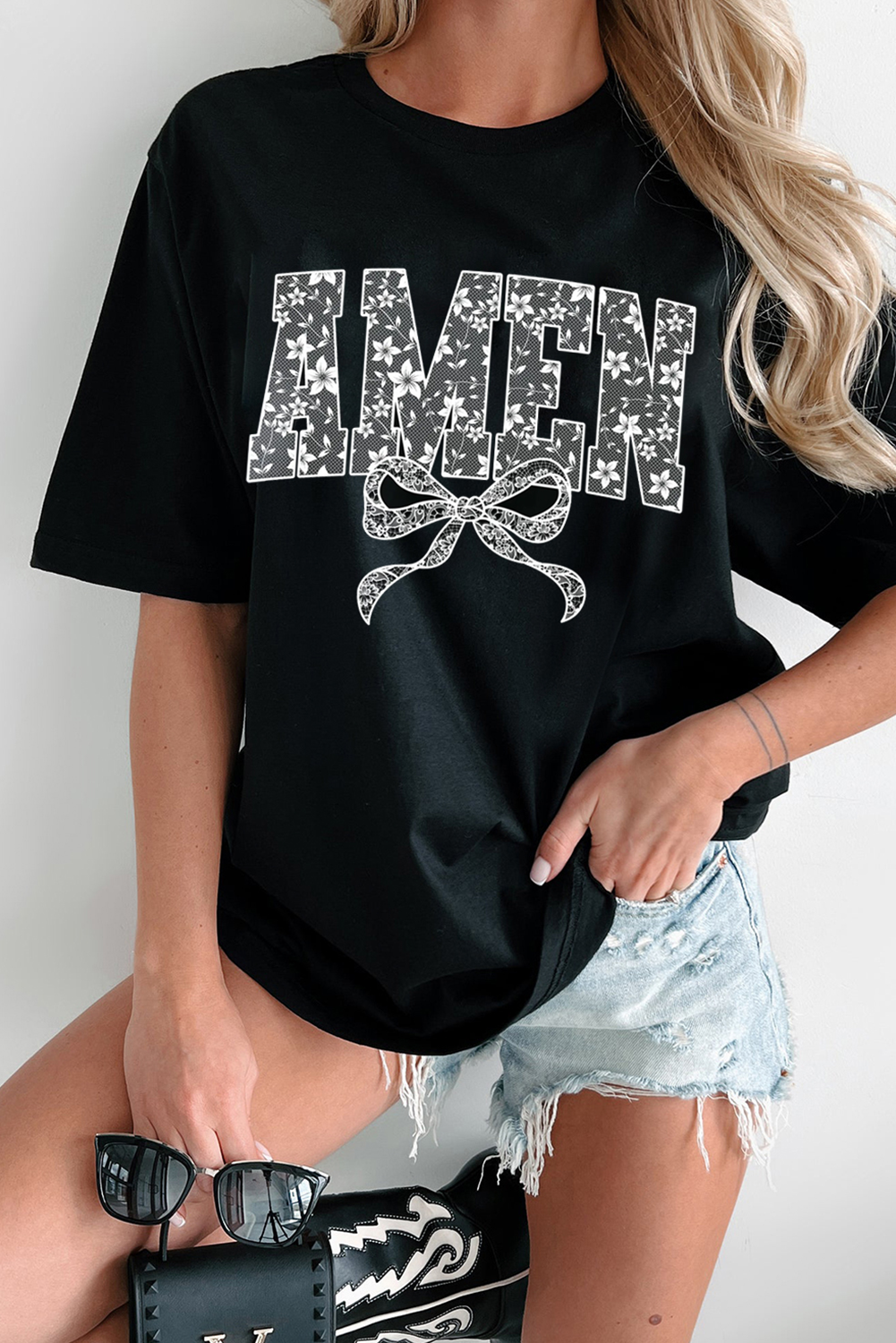 Black Floral AMEN Bow Printed T Shirt