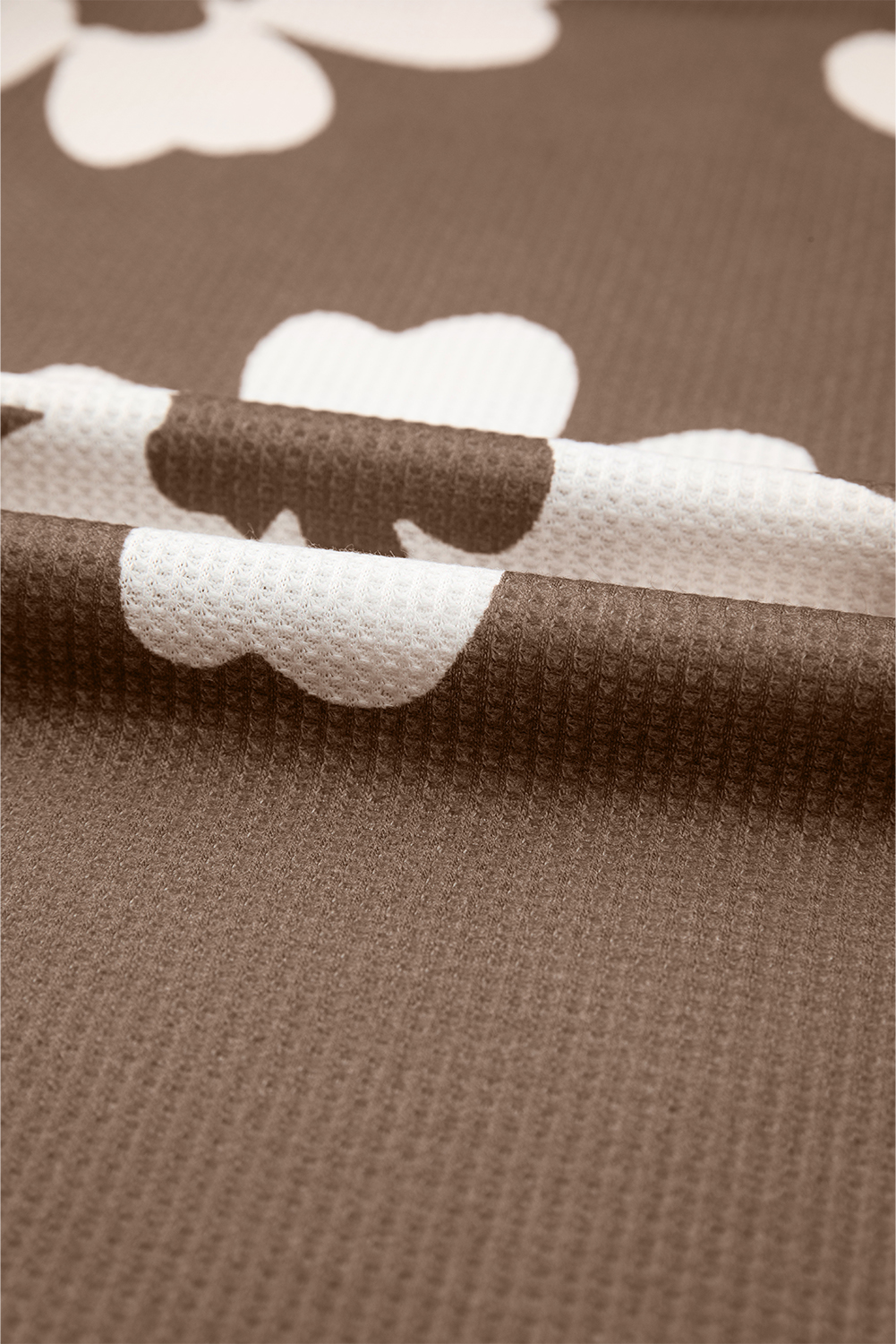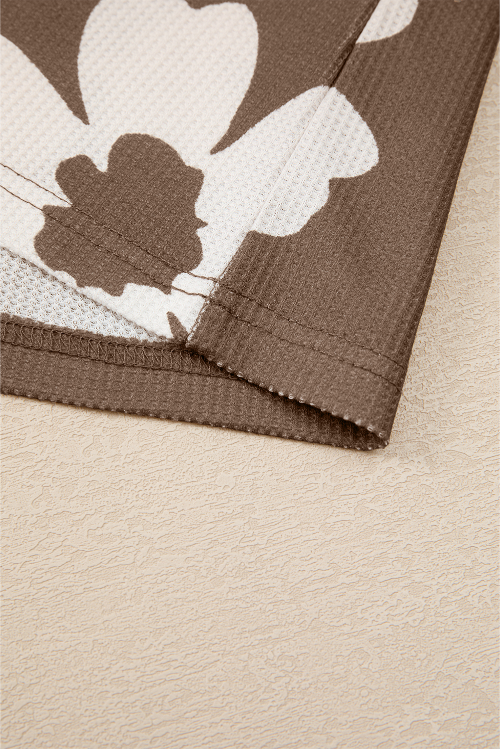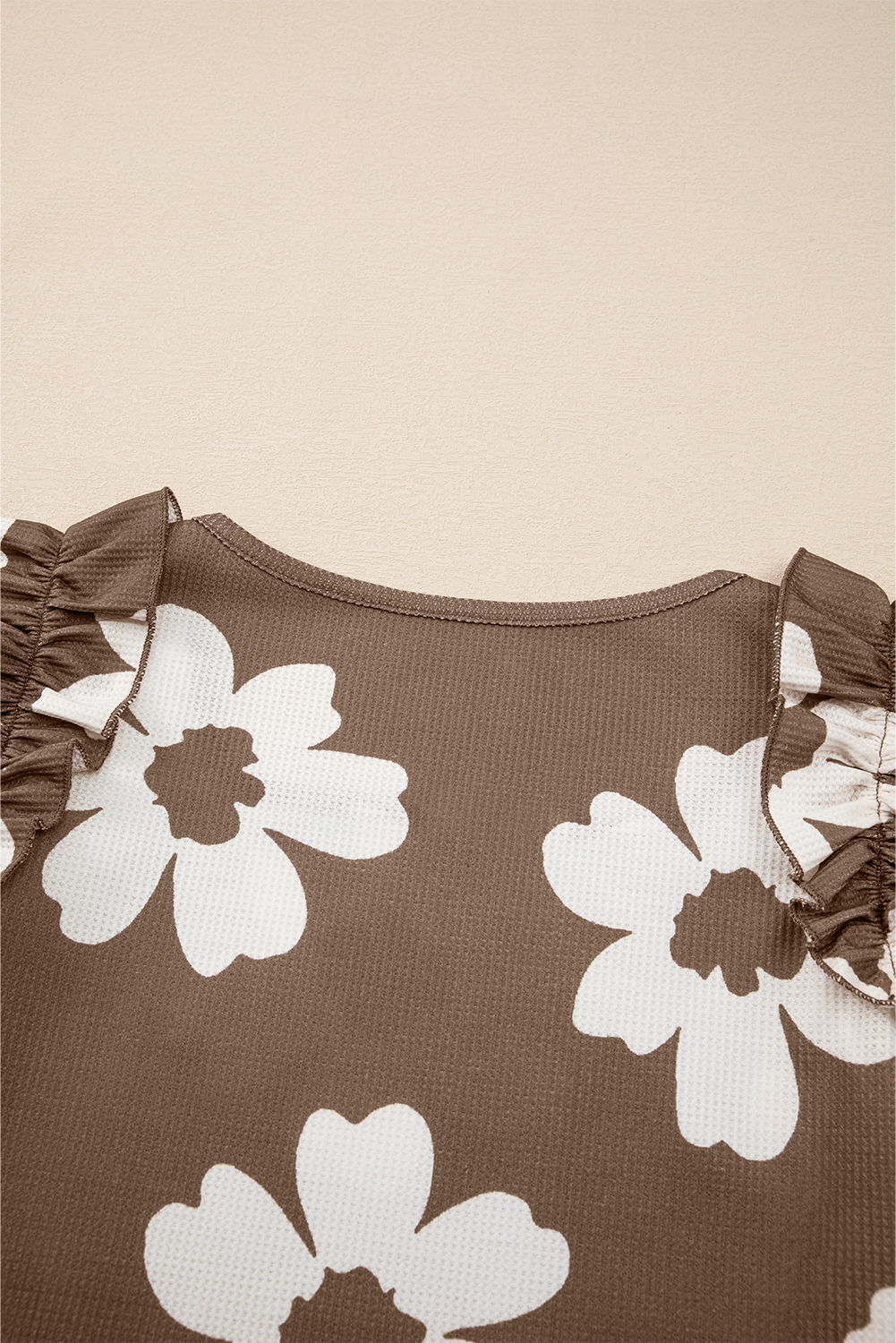 Brown Floral Textured Ruffled Short Sleeve Square Neck Blouse