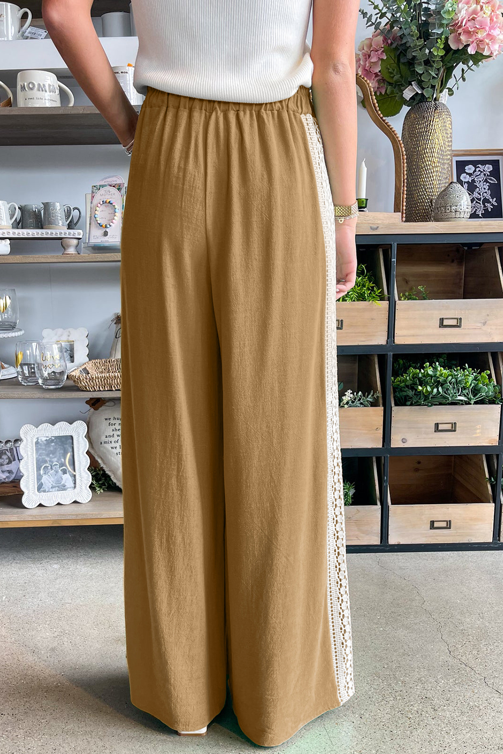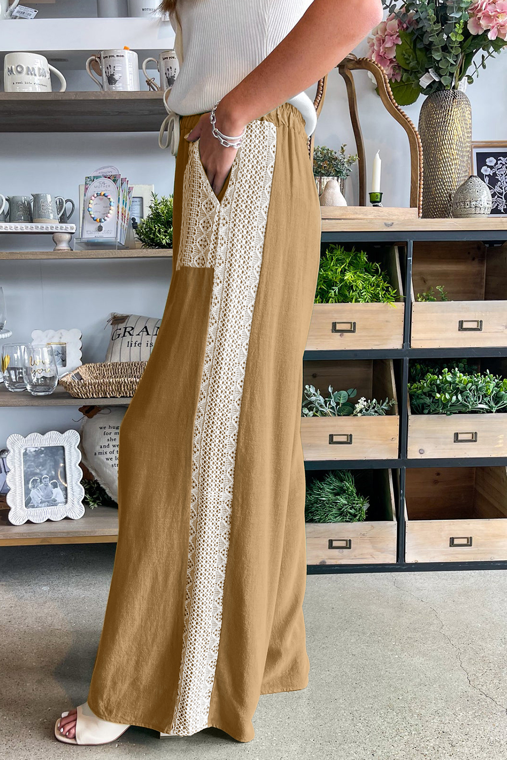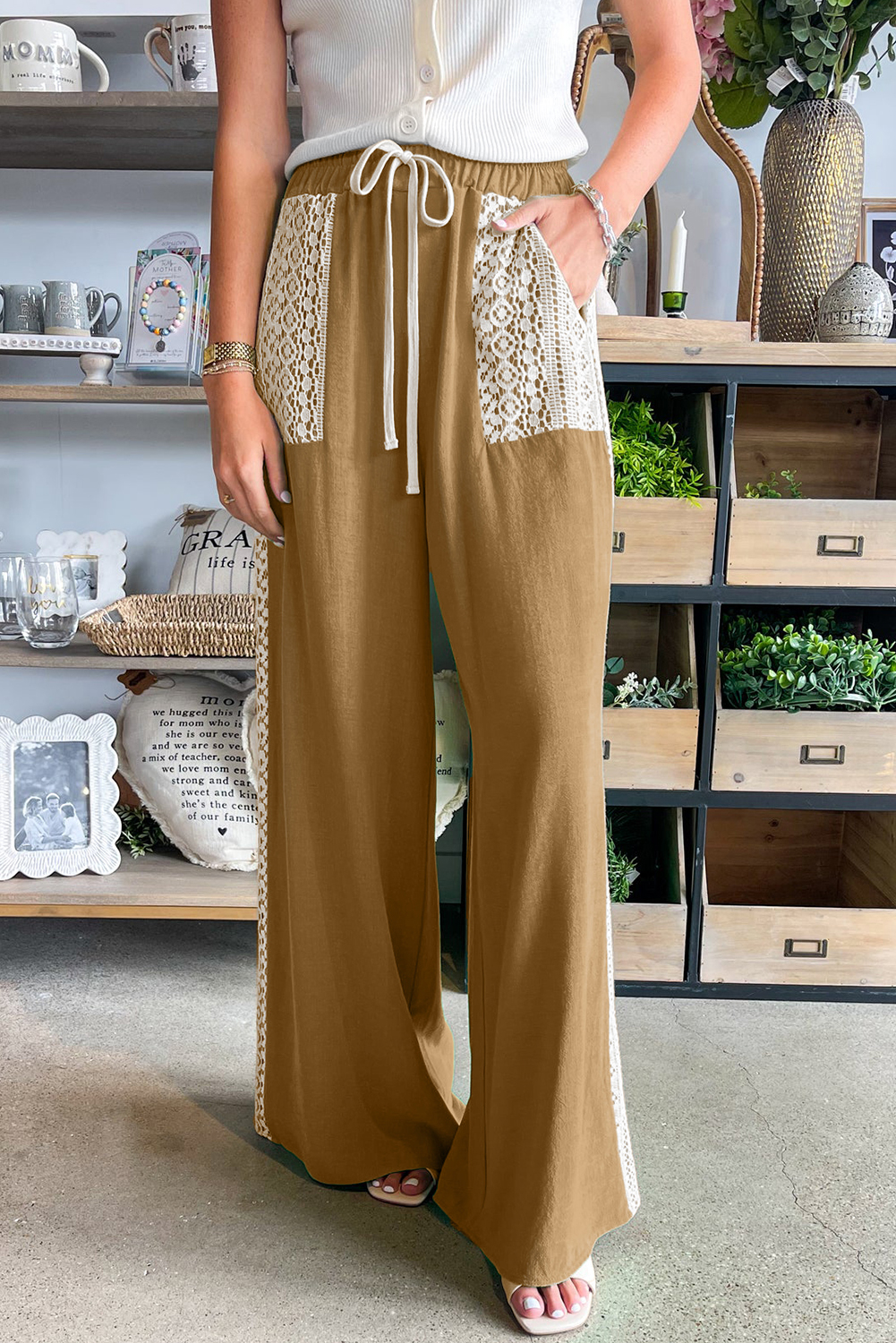 Camel Lace Patched Pocket Drawstring Wide Leg Pants