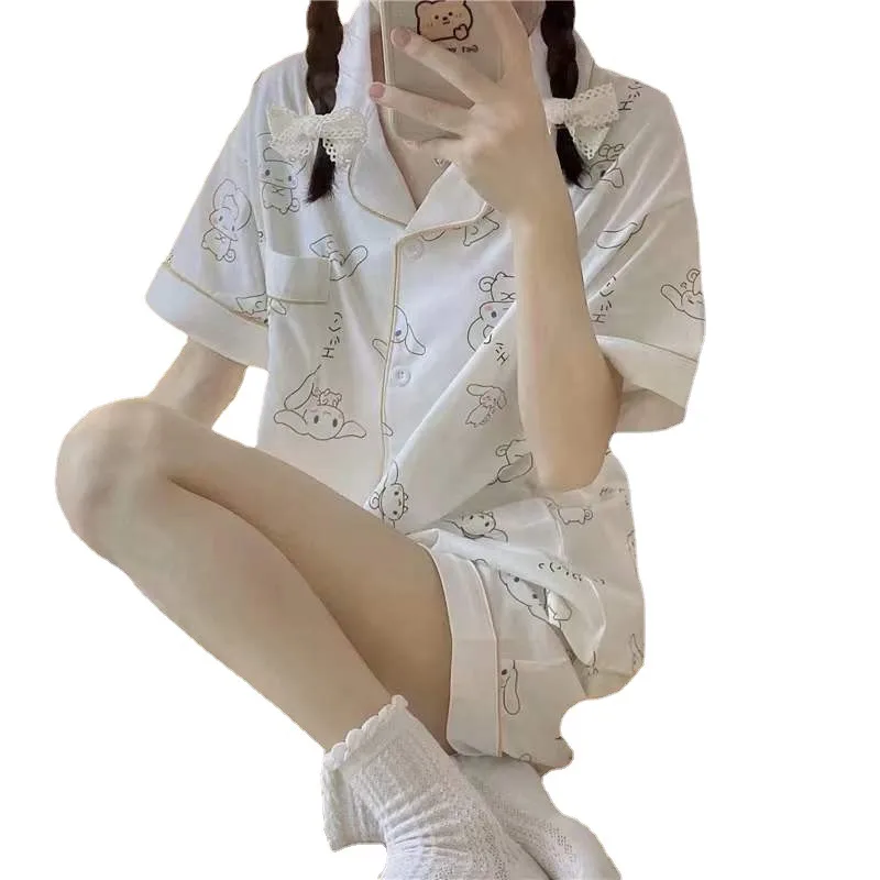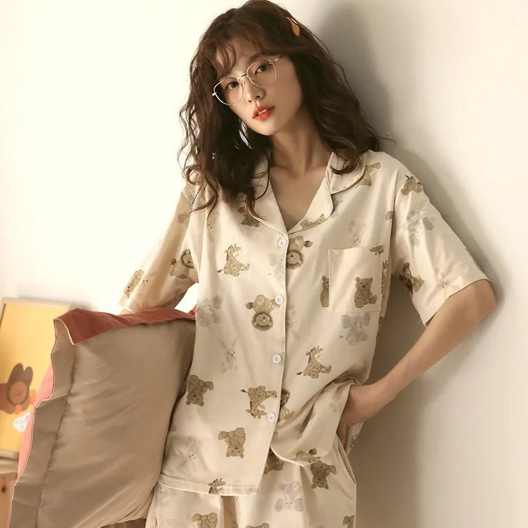 Wholesale Cardigan Pajamas Women's Summer Sweet Short-sleeved Shorts Cute New Style Summer Two-piece Suit Thin Home Clothes Set